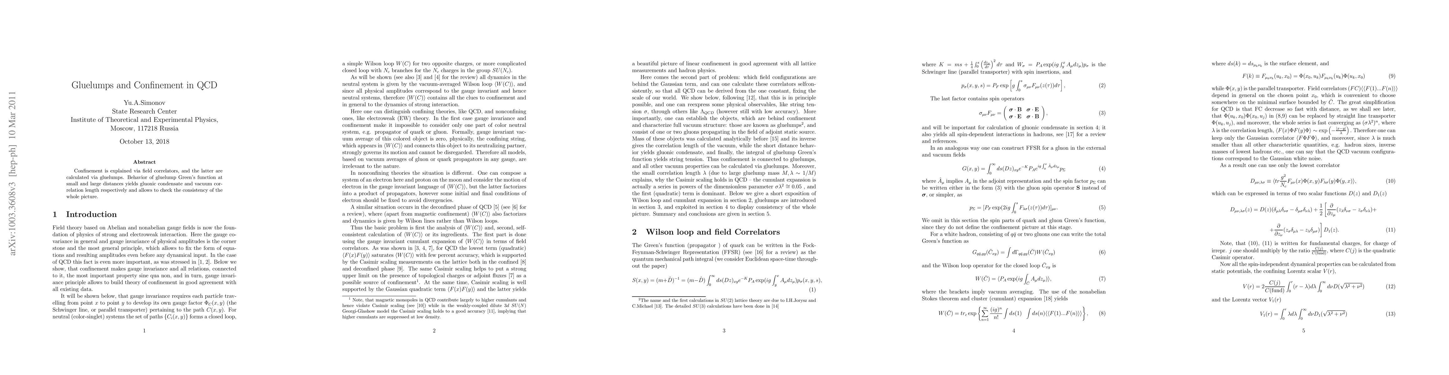 Confinement is explained via field correlators, and the latter are calculated via gluelumps. Behavior of gluelump Green's function at small and large distances yields gluonic condensate and vacuum correlation length respectively and allows to check the consistency of the whole picture.