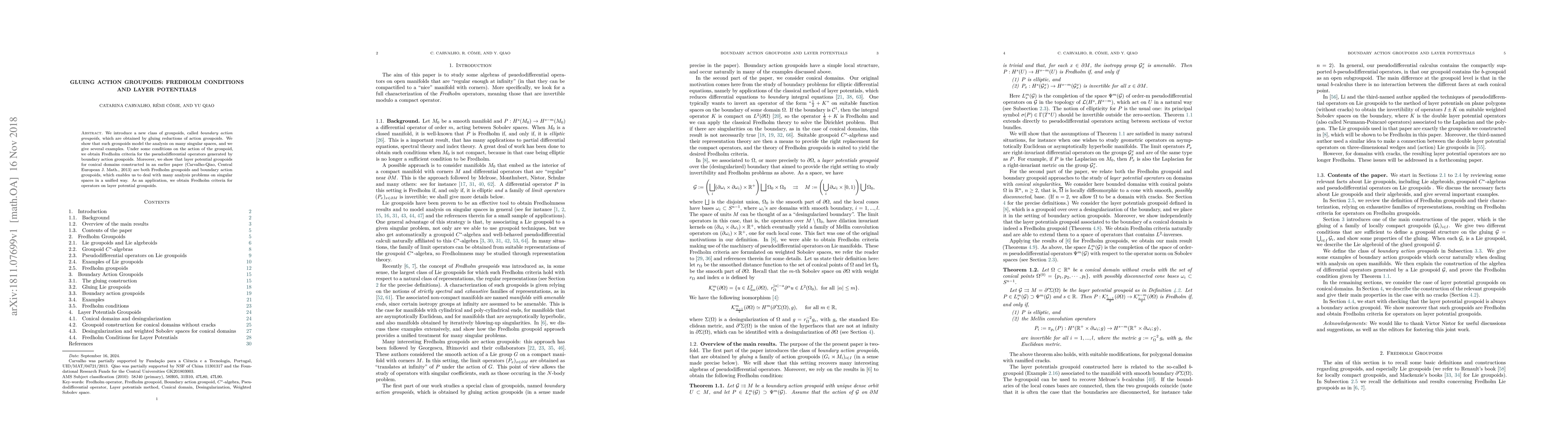 This paper is a merge of arXiv:1807.05418 and arXiv:1808.01442. We introduce a new class of groupoids, called "boundary action groupoids", which are obtained by gluing reductions of action groupoids. We show that such groupoids model the analysis on many singular spaces, and we give several examples. Under some conditions on the action of the groupoid, we obtain Fredholm criteria for the pseudodifferential operators generated by boundary action groupoids. Moreover, we show that layer potential groupoids for conical domains constructed in an earlier paper (Carvalho-Qiao, Central European J. Math., 2013) are both Fredholm groupoids and boundary action groupoids, which enables us to deal with many analysis problems on singular spaces in a unified way. As an application, we obtain Fredholm criteria for operators on layer potential groupoids.