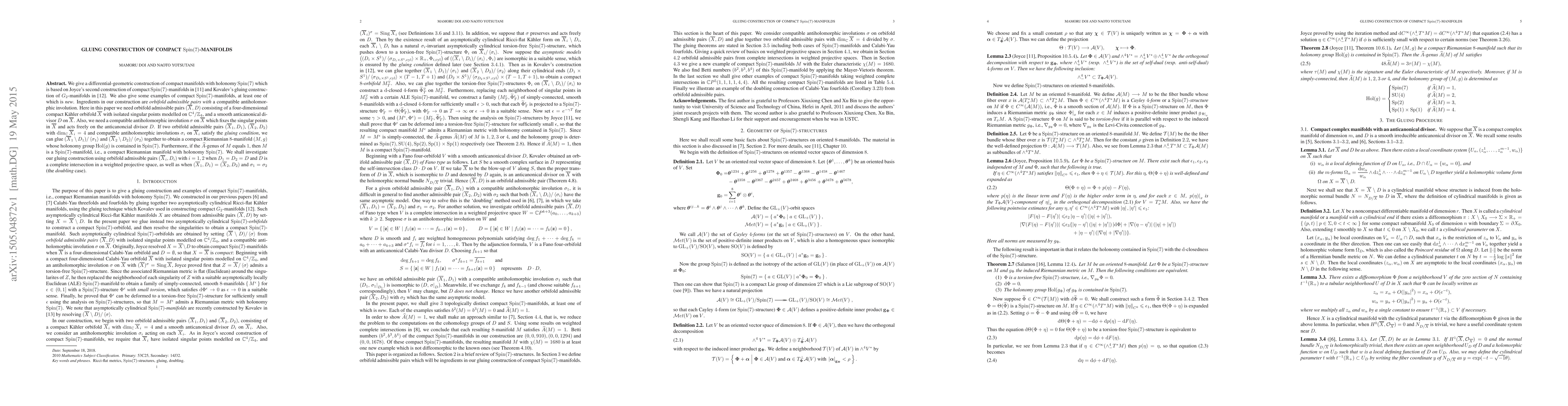 This paper presents a differential-geometric method to construct compact Spin(7)-manifolds using orbifold admissible pairs with compatible antiholomorphic involutions. By gluing two compatible pairs under certain conditions, it produces a manifold with holonomy contained in Spin(7), and specifically Spin(7) when the $\widehat{A}$-genus equals 1.