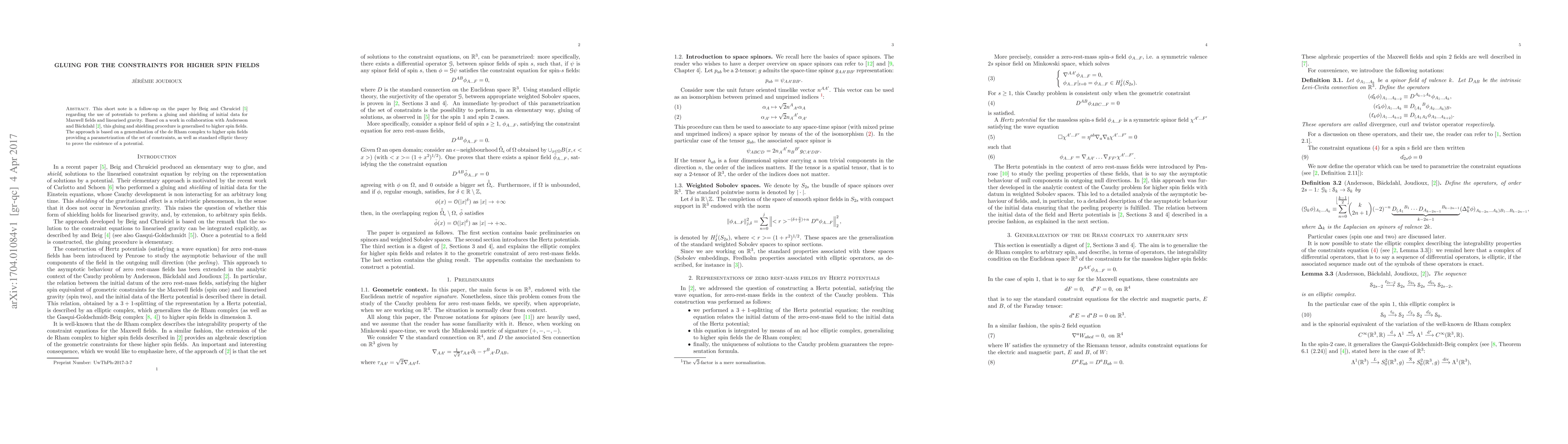 Researchers generalize a method to create gluing and shielding procedures for higher spin fields, enabling solutions to constraints using elliptic theory and de Rham complex.