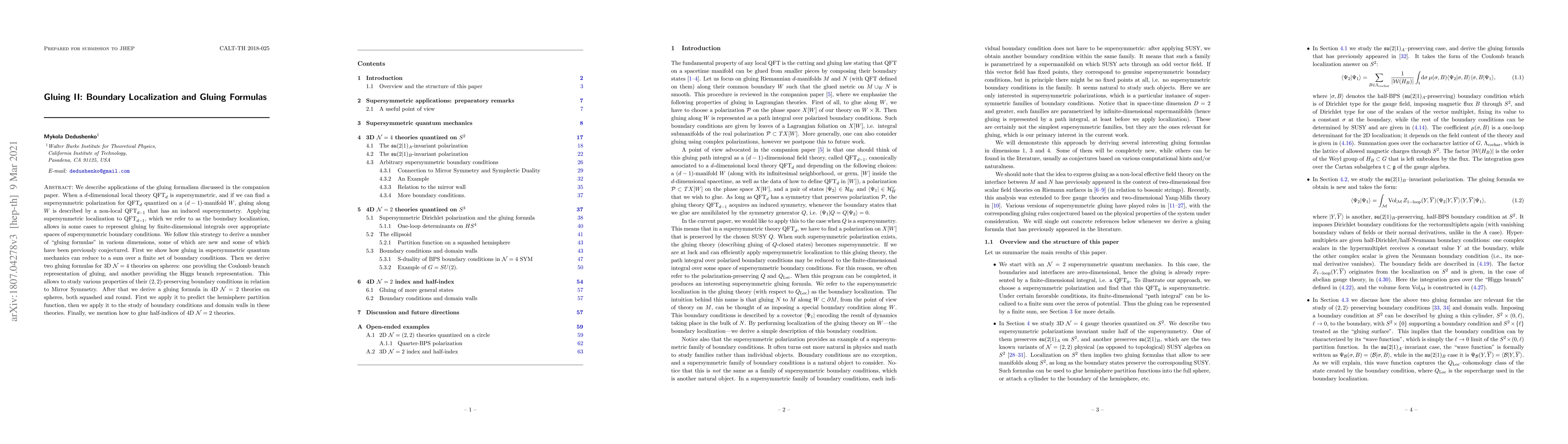 We describe applications of the gluing formalism discussed in the companion paper. When a $d$-dimensional local theory $\text{QFT}_d$ is supersymmetric, and if we can find a supersymmetric polarization for $\text{QFT}_d$ quantized on a $(d-1)$-manifold $W$, gluing along $W$ is described by a non-local $\text{QFT}_{d-1}$ that has an induced supersymmetry. Applying supersymmetric localization to $\text{QFT}_{d-1}$, which we refer to as the boundary localization, allows in some cases to represent gluing by finite-dimensional integrals over appropriate spaces of supersymmetric boundary conditions. We follow this strategy to derive a number of `gluing formulas' in various dimensions, some of which are new and some of which have been previously conjectured. First we show how gluing in supersymmetric quantum mechanics can reduce to a sum over a finite set of boundary conditions. Then we derive two gluing formulas for 3D $\mathcal{N}=4$ theories on spheres: one providing the Coulomb branch representation of gluing, and another providing the Higgs branch representation. This allows to study various properties of their $(2,2)$-preserving boundary conditions in relation to Mirror Symmetry. After that we derive a gluing formula in 4D $\mathcal{N}=2$ theories on spheres, both squashed and round. First we apply it to predict the hemisphere partition function, then we apply it to the study of boundary conditions and domain walls in these theories. Finally, we mention how to glue half-indices of 4D $\mathcal{N}=2$ theories.
