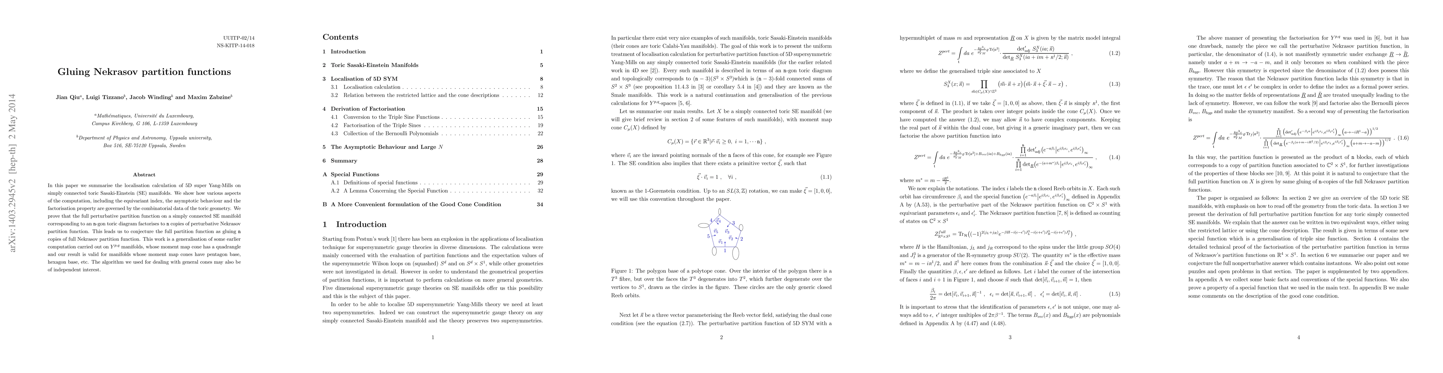 In this paper we summarise the localisation calculation of 5D super Yang-Mills on simply connected toric Sasaki-Einstein (SE) manifolds. We show how various aspects of the computation, including the equivariant index, the asymptotic behaviour and the factorisation property are governed by the combinatorial data of the toric geometry. We prove that the full perturbative partition function on a simply connected SE manifold corresponding to an n-gon toric diagram factorises to n copies of perturbative Nekrasov partition function. This leads us to conjecture the full partition function as gluing n copies of full Nekrasov partition function. This work is a generalisation of some earlier computation carried out on $Y^{p,q}$ manifolds, whose moment map cone has a quadrangle and our result is valid for manifolds whose moment map cones have pentagon base, hexagon base, etc. The algorithm we used for dealing with general cones may also be of independent interest.
