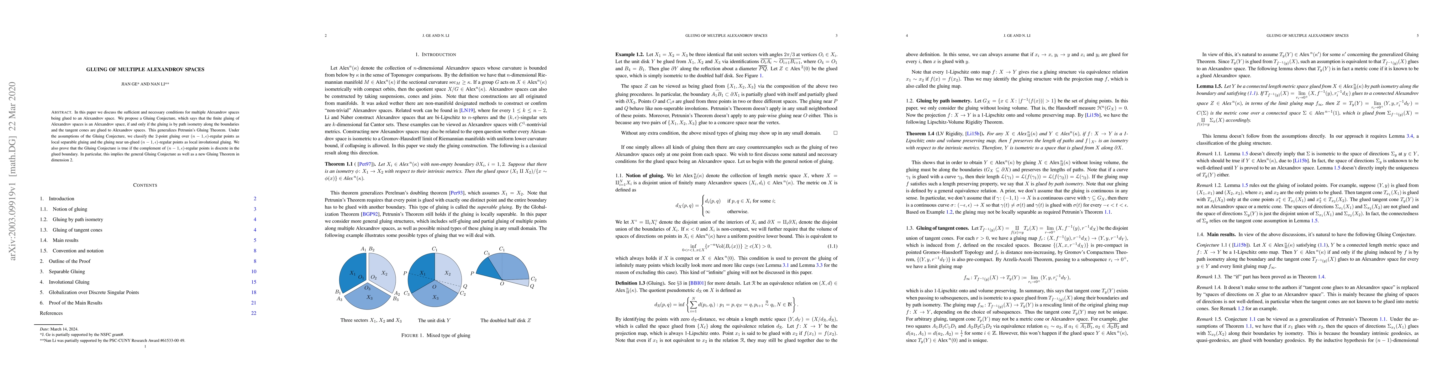 In this paper we discuss the sufficient and necessary conditions for multiple Alexandrov spaces being glued to an Alexandrov space. We propose a Gluing Conjecture, which says that the finite gluing of Alexandrov spaces is an Alexandrov space, if and only if the gluing is by path isometry along the boundaries and the tangent cones are glued to Alexandrov spaces. This generalizes Petrunin's Gluing Theorem. Under the assumptions of the Gluing Conjecture, we classify the $2$-point gluing over $(n-1,\epsilon)$-regular points as local separable gluing and the gluing near un-glued $(n-1,\epsilon)$-regular points as local involutional gluing. We also prove that the Gluing Conjecture is true if the complement of $(n-1,\epsilon)$-regular points is discrete in the glued boundary. In particular, this implies the general Gluing Conjecture as well as a new Gluing Theorem in dimension 2.