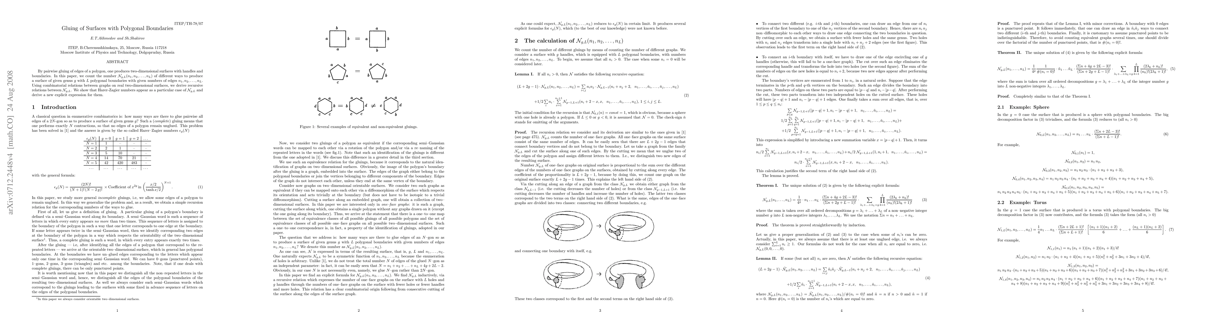 By pairwise gluing of edges of a polygon, one produces two-dimensional surfaces with handles and boundaries. In this paper, we count the number ${\cal N}_{g,L}(n_1, n_2, ..., n_L)$ of different ways to produce a surface of given genus $g$ with $L$ polygonal boundaries with given numbers of edges $n_1, n_2, >..., n_L$. Using combinatorial relations between graphs on real two-dimensional surfaces, we derive recursive relations between ${\cal N}_{g,L}$. We show that Harer-Zagier numbers appear as a particular case of ${\cal N}_{g,L}$ and derive a new explicit expression for them.