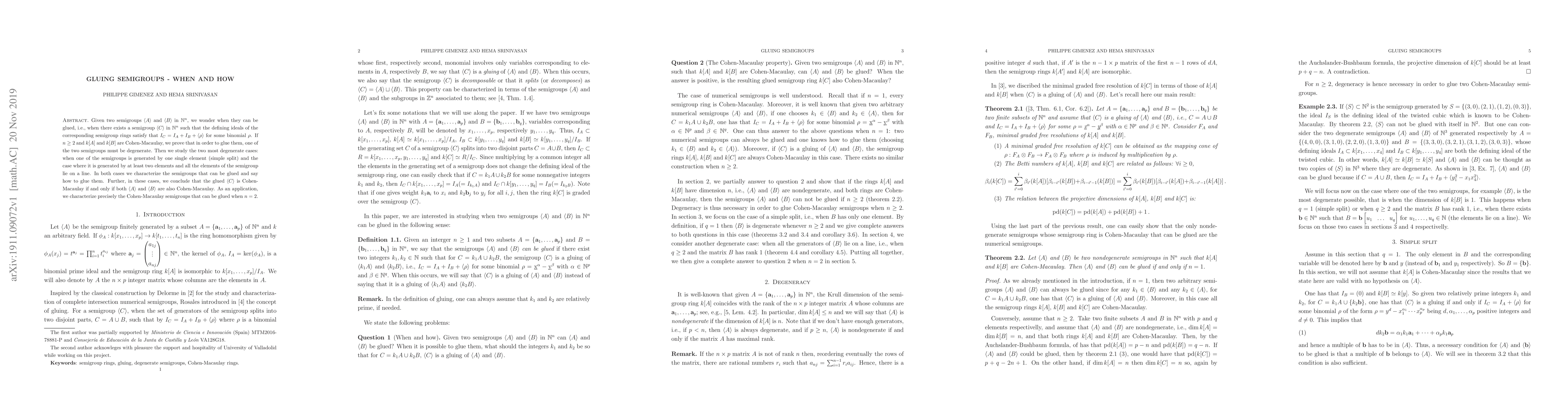 Given two semigroups $\langle A\rangle$ and $\langle B\rangle$ in ${\mathbb N}^n$, we wonder when they can be glued, i.e., when there exists a semigroup $\langle C\rangle$ in ${\mathbb N}^n$ such that the defining ideals of the corresponding semigroup rings satisfy that $I_C=I_A+I_B+\langle\rho\rangle$ for some binomial $\rho$. If $n\geq 2$ and $k[A]$ and $k[B]$ are Cohen-Macaulay, we prove that in order to glue them, one of the two semigroups must be degenerate. Then we study the two most degenerate cases: when one of the semigroups is generated by one single element (simple split) and the case where it is generated by at least two elements and all the elements of the semigroup lie on a line. In both cases we characterize the semigroups that can be glued and say how to glue them. Further, in these cases, we conclude that the glued $\langle C\rangle$ is Cohen-Macaulay if and only if both $\langle A\rangle$ and $\langle B\rangle$ are also Cohen-Macaulay. As an application, we characterize precisely the Cohen-Macaulay semigroups that can be glued when $n=2$.