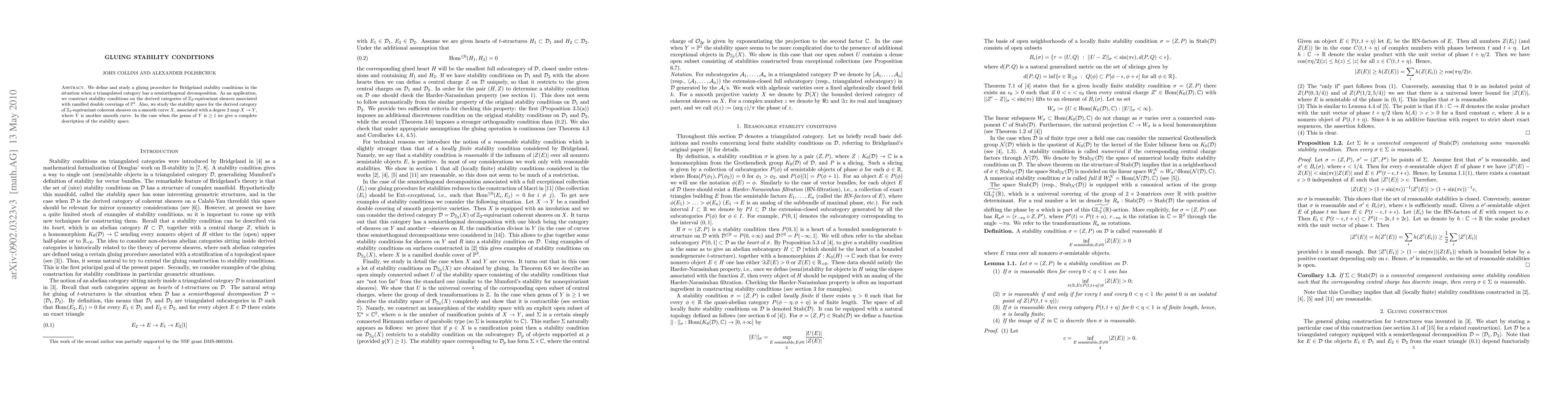 We define and study a gluing procedure for Bridgeland stability conditions in the situation when a triangulated category has a semiorthogonal decomposition. As an application we construct stability conditions on the derived categories of ${\mathbb{Z}}_2$-equivariant sheaves associated with ramified double coverings of ${\mathbb{P}}^3$. Also, we study the stability space for the derived category of ${\mathbb{Z}}_2$-equivariant coherent sheaves on a smooth curve $X$, associated with a degree 2 map $X\to Y$, where $Y$ is another smooth curve. In the case when the genus of $Y$ is $\geq 1$ we give a complete description of the stability space.