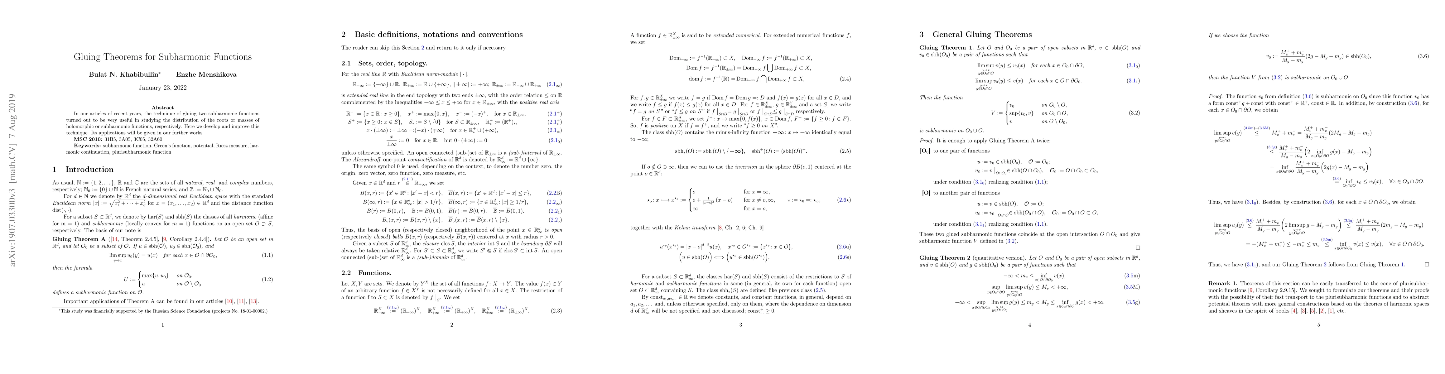 In our articles of recent years, the technique of gluing two subharmonic functions turned out to be very useful in studying the distribution of the roots or masses of holomorphic or subharmonic functions, respectively. Here we develop and improve this technique. Its applications will be given in our further works.