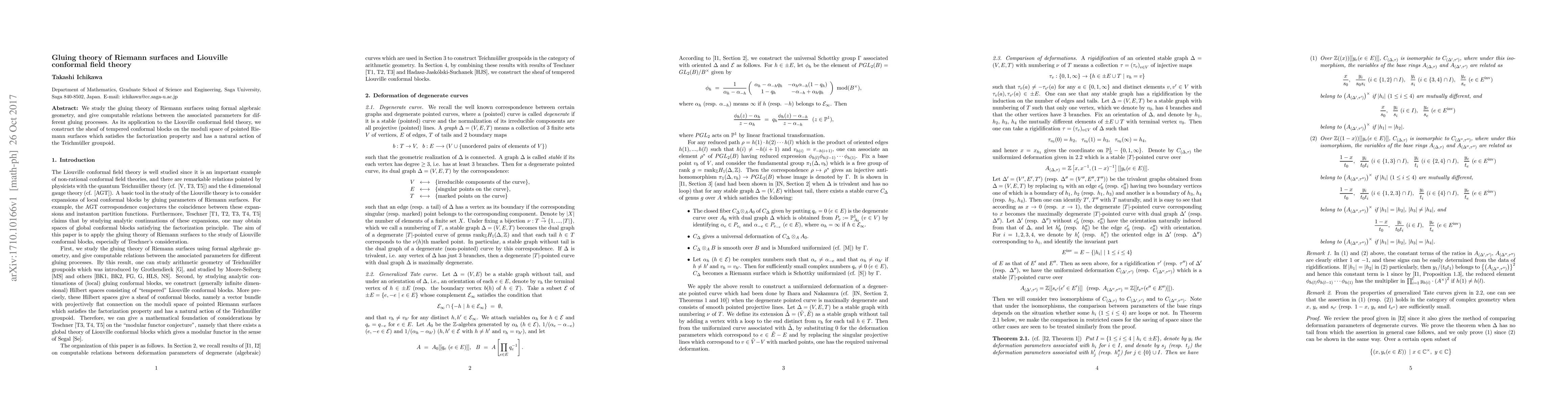 This paper develops a gluing theory for Riemann surfaces through formal algebraic geometry, providing computable relations for different gluing processes. It applies this theory to Liouville conformal field theory by constructing a sheaf of tempered conformal blocks on the moduli space with a natural action of the Teichmüller groupoid.