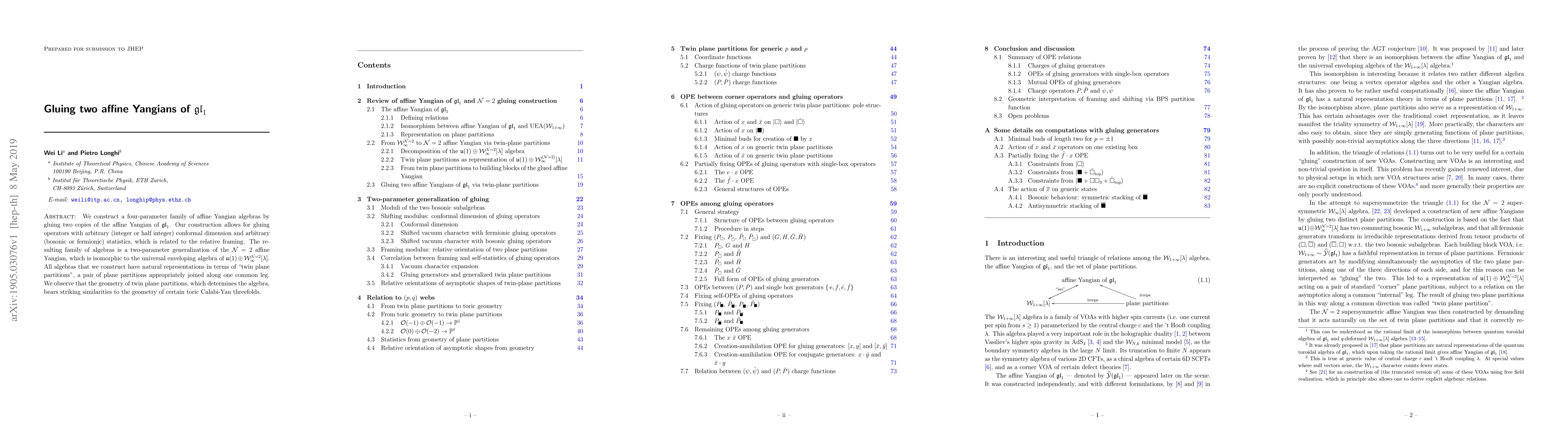 The paper constructs a four-parameter family of affine Yangian algebras by gluing two copies of the affine Yangian of $\mathfrak{gl}_1$, allowing for various conformal dimensions and statistics. The resulting algebras generalize the $\mathcal{N}=2$ affine Yangian and are represented via "twin plane partitions," with a noted geometric similarity to toric Calabi-Yau threefolds.