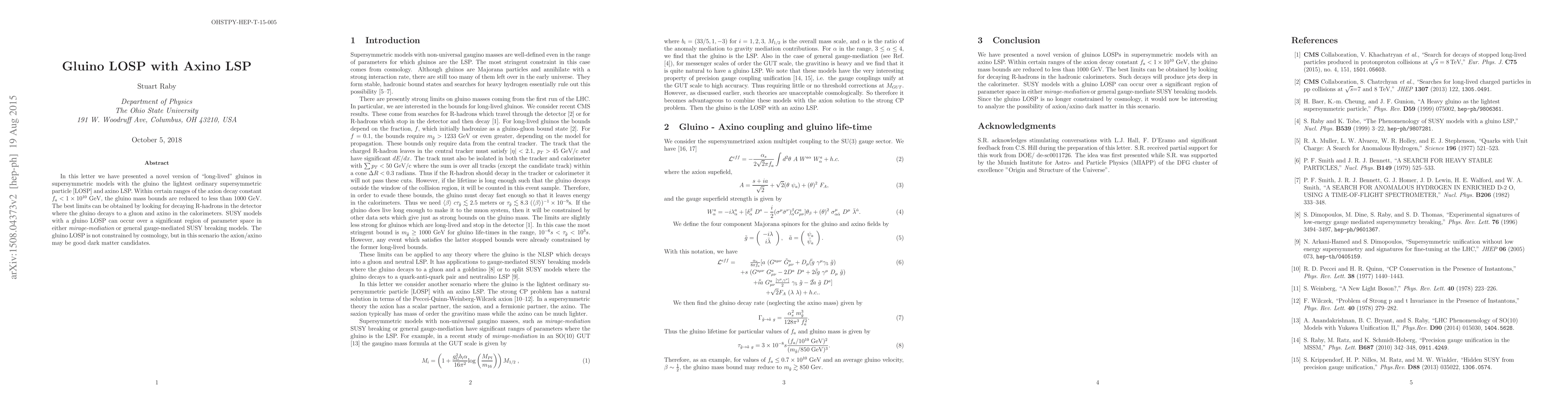 This paper explores "long-lived" gluinos as the lightest ordinary supersymmetric particle (LOSP) in models where the axino is the lightest supersymmetric particle (LSP). It suggests that within specific axion decay constant ranges, gluino mass limits can be reduced, and proposes searching for decaying R-hadrons in detectors to detect the gluino's decay into a gluon and axino.