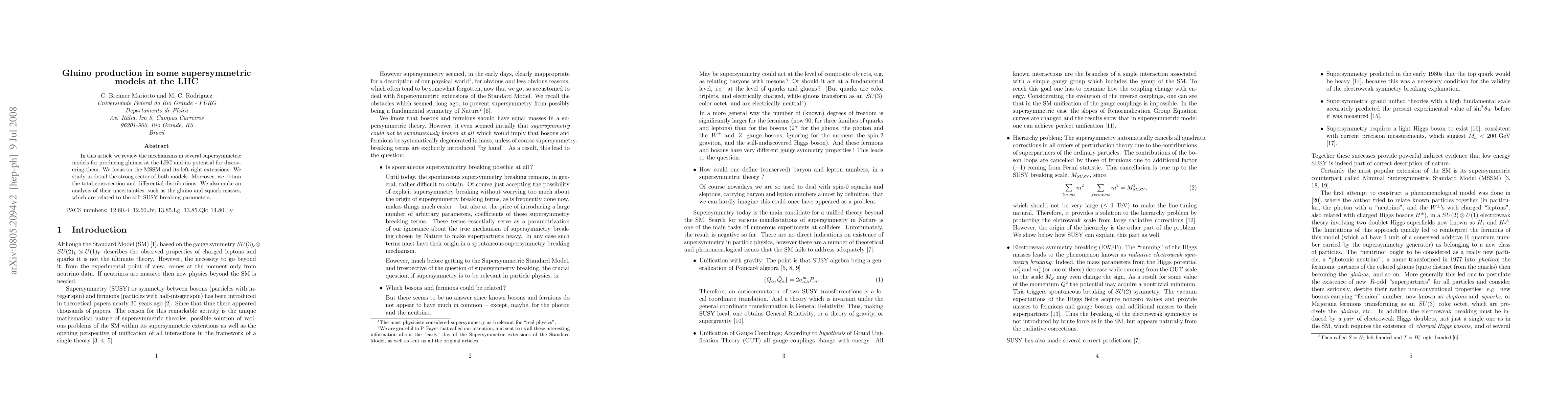 In this article we review the mechanisms in several supersymmetric models for producing gluinos at the LHC and its potential for discovering them. We focus on the MSSM and its left-right extensions. We study in detail the strong sector of both models. Moreover, we obtain the total cross section and differential distributions. We also make an analysis of their uncertainties, such as the gluino and squark masses, which are related to the soft SUSY breaking parameters.