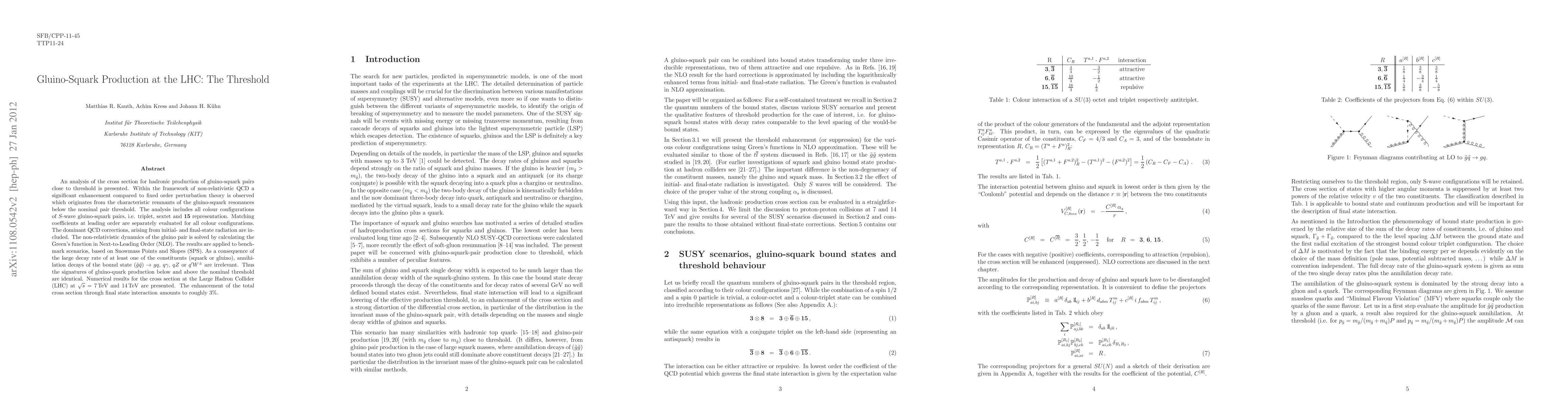 This paper analyzes the cross section for gluino-squark pair production near the threshold at the LHC, revealing a significant enhancement due to non-relativistic QCD effects. The study finds that annihilation decays of the bound state are negligible, leading to identical production signatures above and below the threshold, with a total cross section enhancement of about 3%.