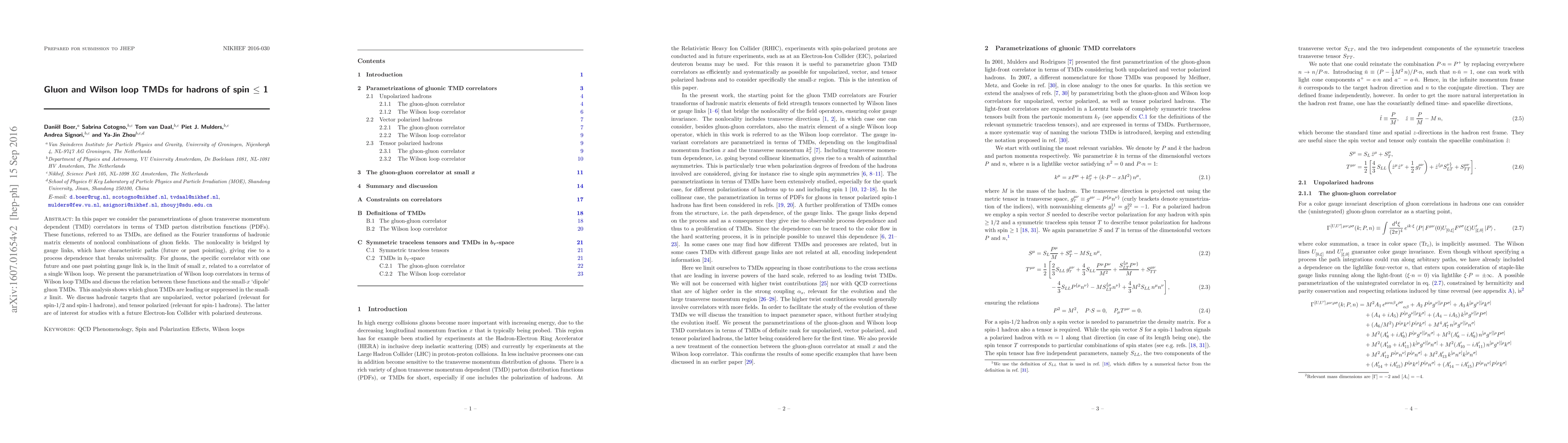 This paper explores the parametrization of gluon transverse momentum dependent (TMD) correlators in terms of TMD parton distribution functions, bridging nonlocal gauge links with Wilson loop correlators. It analyzes the relationship between these functions in the small-$x$ limit and discusses their implications for unpolarized, vector, and tensor polarized hadrons, including those of spin $\leq$ 1 relevant for future Electron-Ion Collider studies.