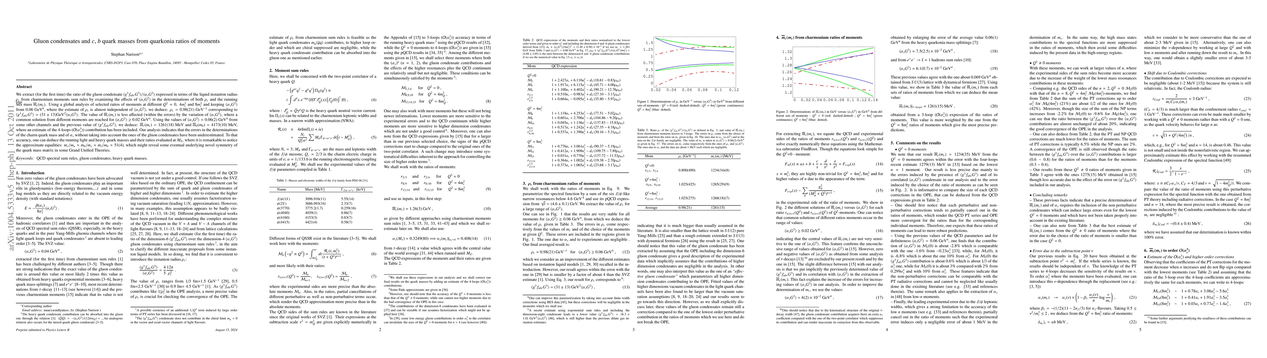 We extract (for the first time) the ratio of the gluon condensate < g^3f_{abc}G^3 >/< alpha_s G^2 > expressed in terms of the liquid instanton radius rho_c from charmonium moments sum rules by examining the effects of < alpha_s G^2 > in the determinations of both rho_c and the running MS mass m_c(m_c). Using a global analysis of selected ratios of moments at different Q^2=0, 4m_c^2 and 8m_c^2 and taking < alpha_s G^2 > from 0.06 GeV^4, where the estimate of rho_c is almost independent of < alpha_s G^2 >, we deduce: rho_c=0.98(21) GeV^{-1} which corresponds to < g^3f_{abc}G^3 > = (31+- 13) GeV^2 < alpha_s G^2 >. The value of m_c(m_c) is less affected (within the errors) by the variation of < alpha_s G^2 >, where a common solution from different moments are reached for < alpha_s G^2 > greater than 0.02 GeV^4. Using the values of < alpha_s G^2 >=0.06(2) GeV^4 from some other channels and the previous value of < g^3f_{abc}G^3 >, we deduce: m_c(m_c)=1260(18) MeV and m_b(m_b)=4173(10) MeV, where an estimate of the 4-loops contribution has been included. Our analysis indicates that the errors in the determinations of the charm quark mass without taking into account the ones of the gluon condensates have been underestimated. To that accuracy, one can deduce the running light and heavy quark masses and their ratios evaluated at M_Z, where it is remarkable to notice the approximate equalities: m_s/m_u= m_b/m_s= m_t/m_b= 51(4), which might reveal some eventual underlying novel symmetry of the quark mass matrix in some Grand Unified Theories.