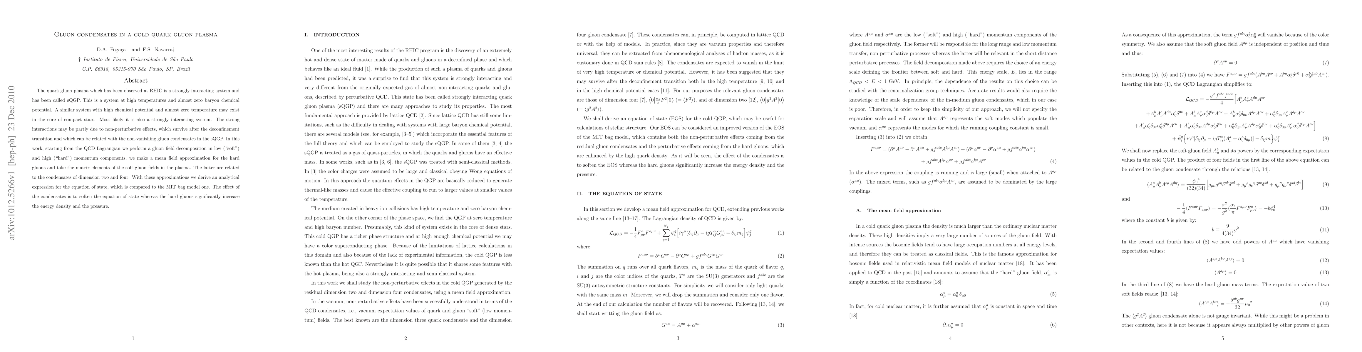 The quark gluon plasma which has been observed at RHIC is a strongly interacting system and has been called sQGP. This is a system at high temperatures and almost zero baryon chemical potential. A similar system with high chemical potential and almost zero temperature may exist in the core of compact stars. Most likely it is also a strongly interacting system. The strong interactions may be partly due to non-perturbative effects, which survive after the deconfinement transition and which can be related with the non-vanishing gluon condensates in the sQGP. In this work, starting from the QCD Lagrangian we perform a gluon field decomposition in low ("soft") and high ("hard") momentum components, we make a mean field approximation for the hard gluons and take the matrix elements of the soft gluon fields in the plasma. The latter are related to the condensates of dimension two and four. With these approximations we derive an analytical expression for the equation of state, which is compared to the MIT bag model one. The effect of the condensates is to soften the equation of state whereas the hard gluons significantly increase the energy density and the pressure.