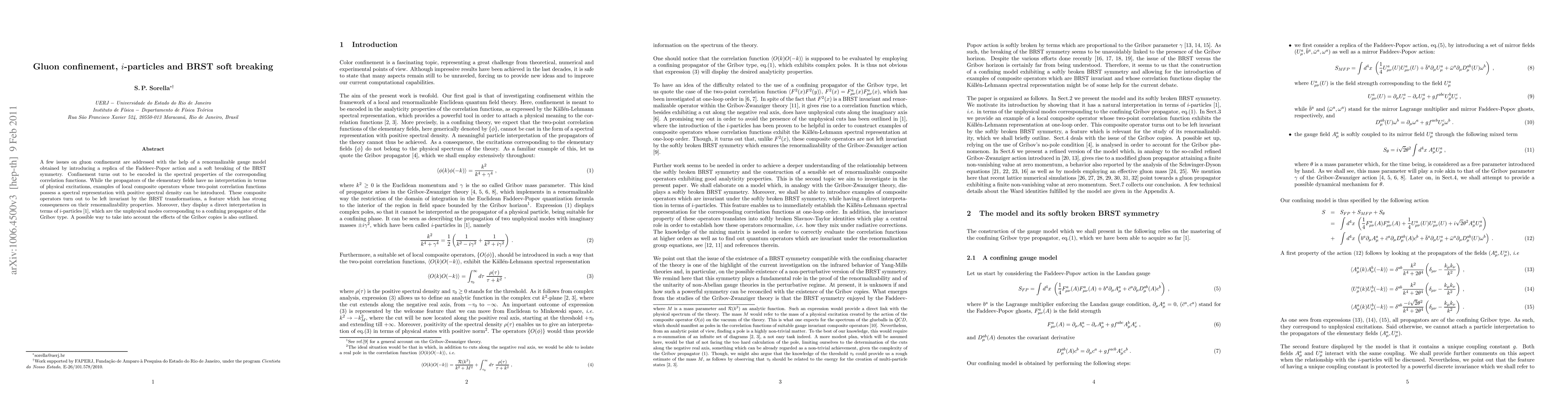 A few issues on gluon confinement are addressed with the help of a renormalizable gauge model obtained by introducing a replica of the Faddeev-Popov action and a soft breaking of the BRST symmetry. Confinement turns out to be encoded in the spectral properties of the corresponding correlation functions. While the propagators of the elementary fields have no interpretation in terms of physical excitations, examples of local composite operators whose two-point correlation functions possess a spectral representation with positive spectral density can be introduced. These composite operators turn out to be left invariant by the BRST transformations, a feature which has strong consequences on their renormalizability properties. Moreover, they display a direct interpretation in terms of i-particles [1], which are the unphysical modes corresponding to a confining propagator of the Gribov type. A possible way to take into account the effects of the Gribov copies is also outlined.