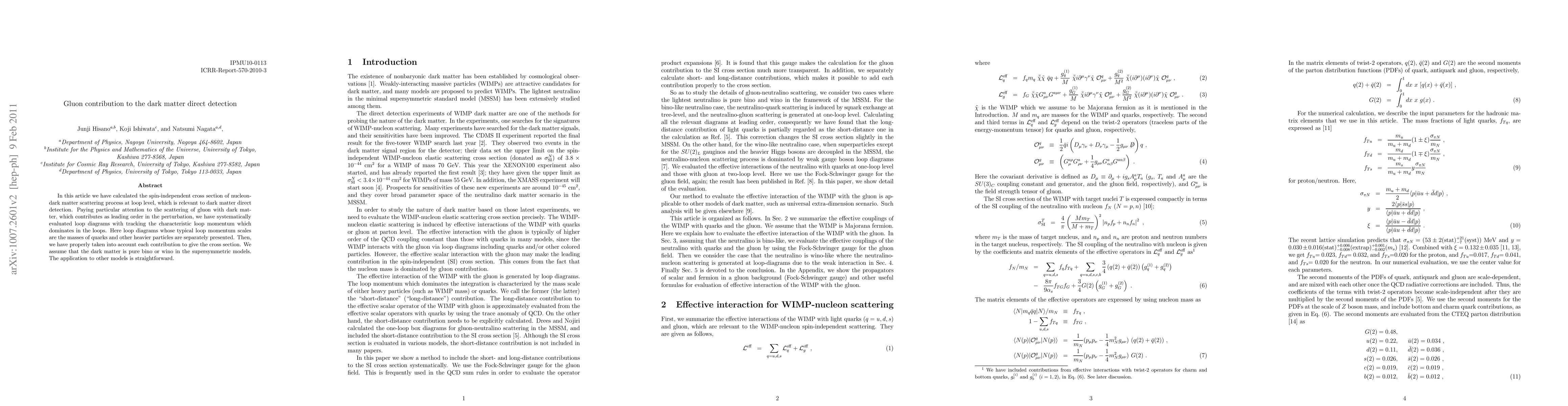 This paper calculates the spin-independent cross section of nucleon-dark matter scattering at loop level, focusing on gluon contributions, which dominate in perturbation theory. The study evaluates relevant loop diagrams, considering the masses of quarks and heavier particles, and applies the findings to pure bino or wino dark matter in supersymmetric models.