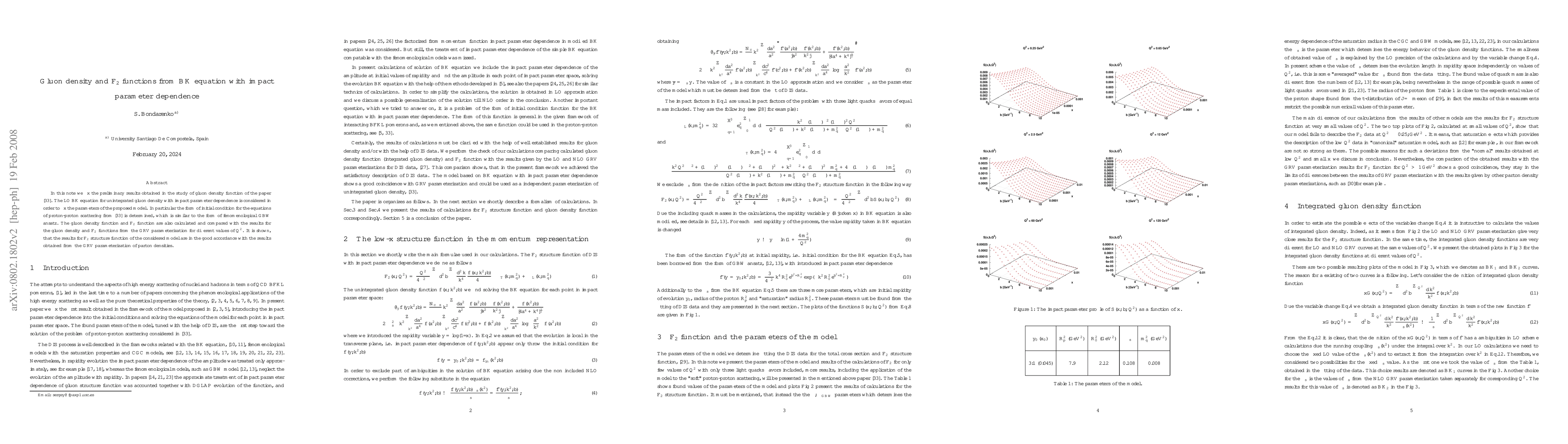 In this note we fix the preliminary results obtained in the study of gluon density function of the paper \cite{bom3}. The LO BK equation for unintegrated gluon density with impact parameter dependence is considered in order to fix the parameters of the proposed model. In particular the form of initial condition for the equations of proton-proton scattering from \cite{bom3} is determined, which is similar to the form of fenomenological GBW ansatz. The gluon density function and $F_{2}$ function are also calculated and compared with the results for the gluon density and $F_{2}$ functions from the GRV parameterization for different values of $Q^2$. It is shown, that the results for $F_2$ structure function of the considered model are in the good accordance with the results obtained from the GRV parameterization of parton densities.
