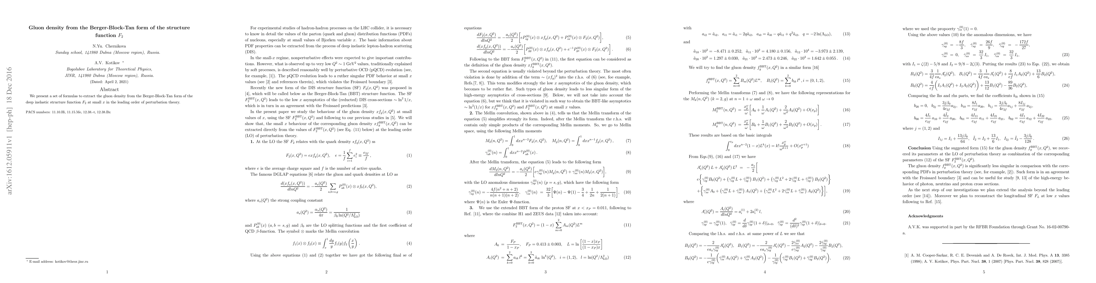 We present a set of formulas to extract the gluon density from the Berger-Block-Tan form of the deep inelastic structure function F2 at small x in the leading order of perturbation theory.