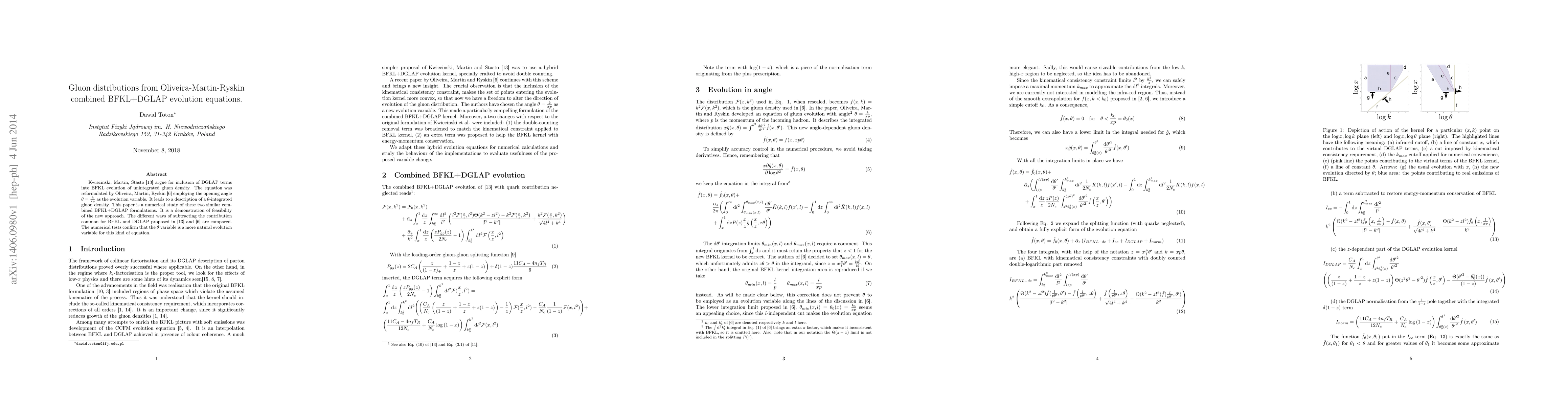 Kwiecinski, Martin, Stasto [13] argue for inclusion of DGLAP terms into BFKL evolution of unintegrated gluon density. The equation was reformulated by Oliveira, Martin, Ryskin [6] employing the opening angle {\theta} = k/xp as the evolution variable. It leads to a description of a {\theta}-integrated gluon density. This paper is a numerical study of these two similar combined BFKL+DGLAP formulations. It is a demonstration of feasibility of the new approach. The different ways of subtracting the contribution common for BFKL and DGLAP proposed in [13] and [6] are compared. The numerical tests confirm that the {\theta} variable is a more natural evolution variable for this kind of equation.