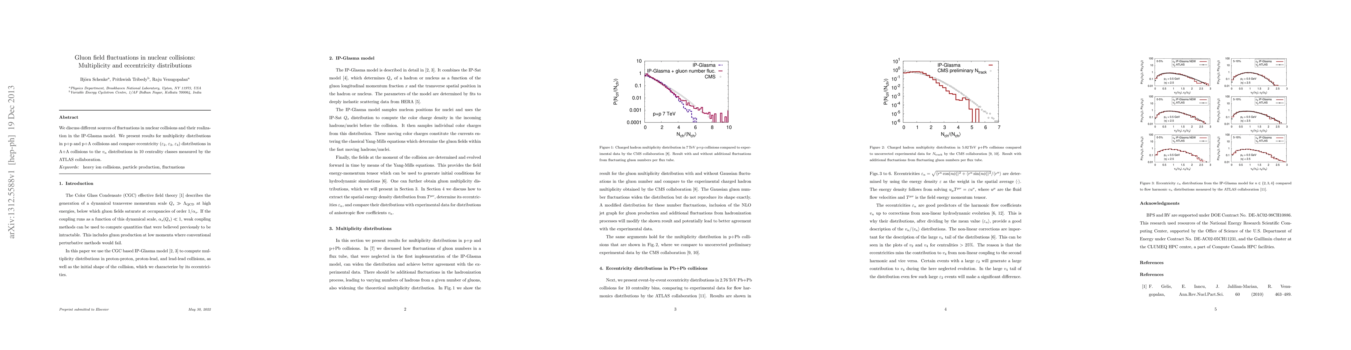 Summary: This paper explores fluctuations in gluon fields during nuclear collisions using the IP-Glasma model, presenting results for multiplicity distributions in proton-proton and proton-nucleus collisions, and comparing eccentricity distributions in nucleus-nucleus collisions to ATLAS flow harmonic data.