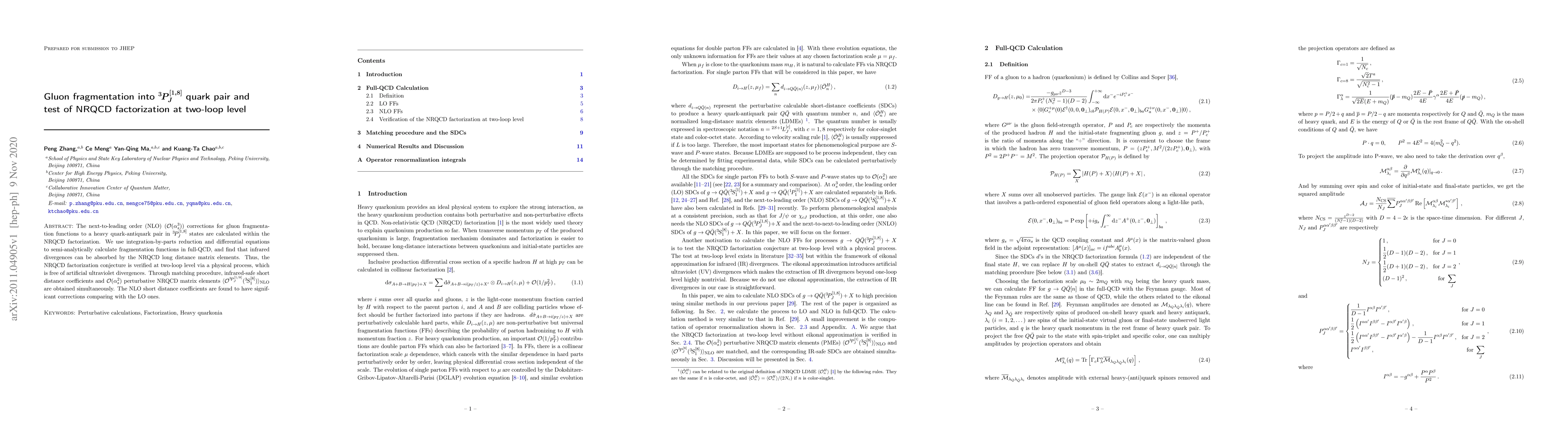The next-to-leading order (NLO) ($\mathcal{O}(\alpha_s^3)$) corrections for gluon fragmentation functions to a heavy quark-antiquark pair in ${^{3}\hspace{-0.6mm}P_{J}^{[1,8]}}$ states are calculated within the NRQCD factorization. We use integration-by-parts reduction and differential equations to semi-analytically calculate fragmentation functions in full-QCD, and find that infrared divergences can be absorbed by the NRQCD long distance matrix elements. Thus, the NRQCD factorization conjecture is verified at two-loop level via a physical process, which is free of artificial ultraviolet divergences. Through matching procedure, infrared-safe short distance coefficients and $\mathcal{O}(\alpha_s^2)$ perturbative NRQCD matrix elements $\langle{\mathcal O}^{{^{3}\hspace{-0.6mm}P_{J}^{[1,8]}}}({^{3}\hspace{-0.6mm}S_{1}^{[8]}})\rangle_{\mathrm{NLO}}$ are obtained simultaneously. The NLO short distance coefficients are found to have significant corrections comparing with the LO ones.