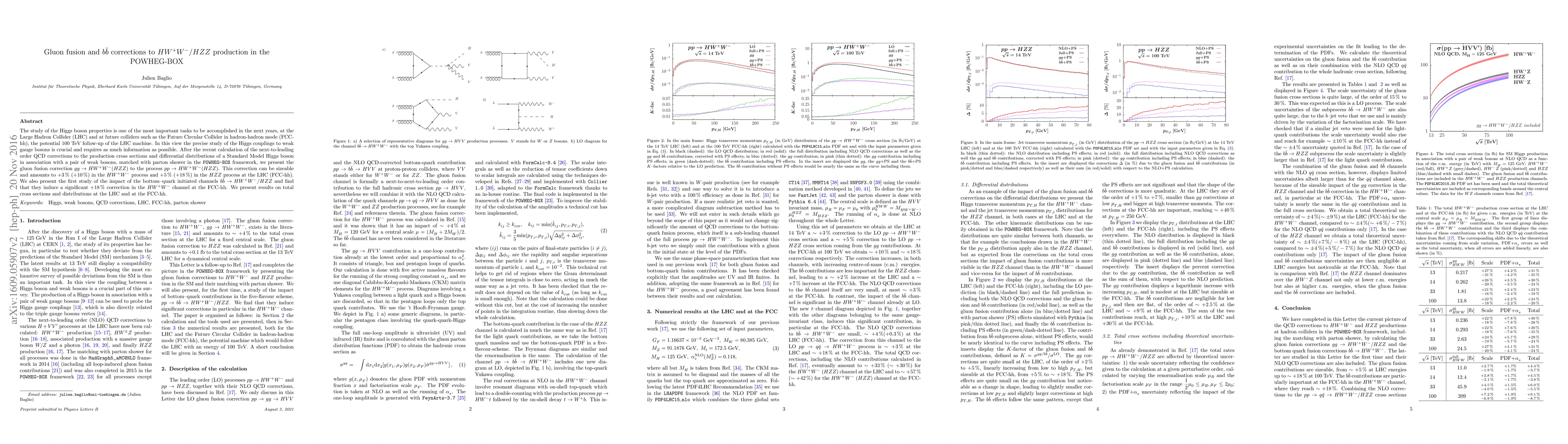 This paper investigates the gluon fusion and $b\bar{b}$ corrections to Higgs boson production in association with weak gauge bosons ($H W^+ W^-$ or $H Z Z$) using the POWHEG-BOX framework. It finds significant corrections, up to +18% at FCC-hh, emphasizing the importance of precise calculations for Higgs coupling studies.