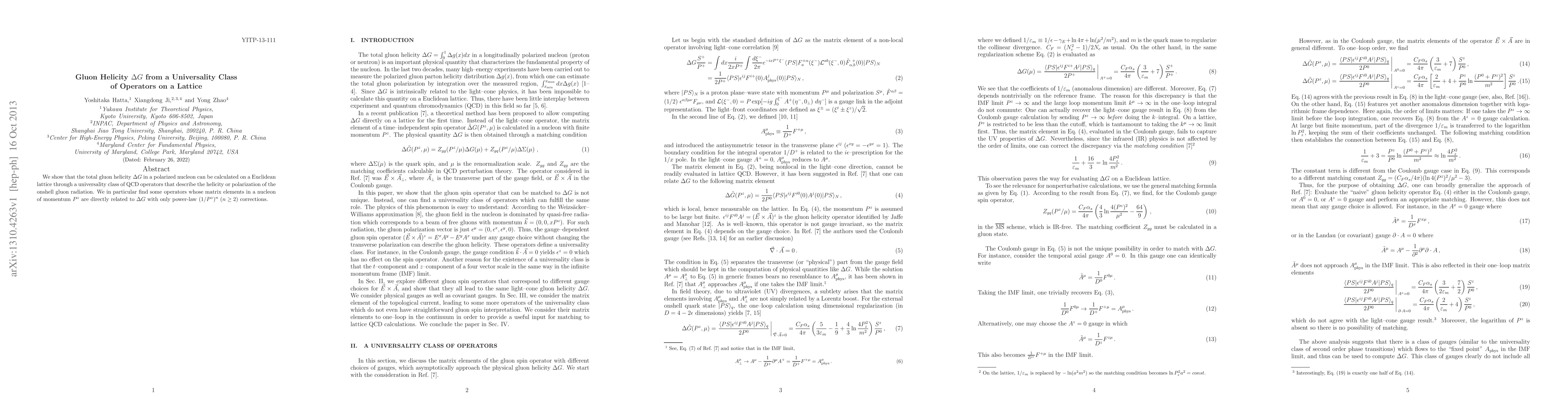 This paper demonstrates that the total gluon helicity $\Delta G$ in a polarized nucleon can be calculated using a set of universality class QCD operators on a Euclidean lattice, revealing operators whose matrix elements are directly related to $\Delta G$ with minimal corrections.
