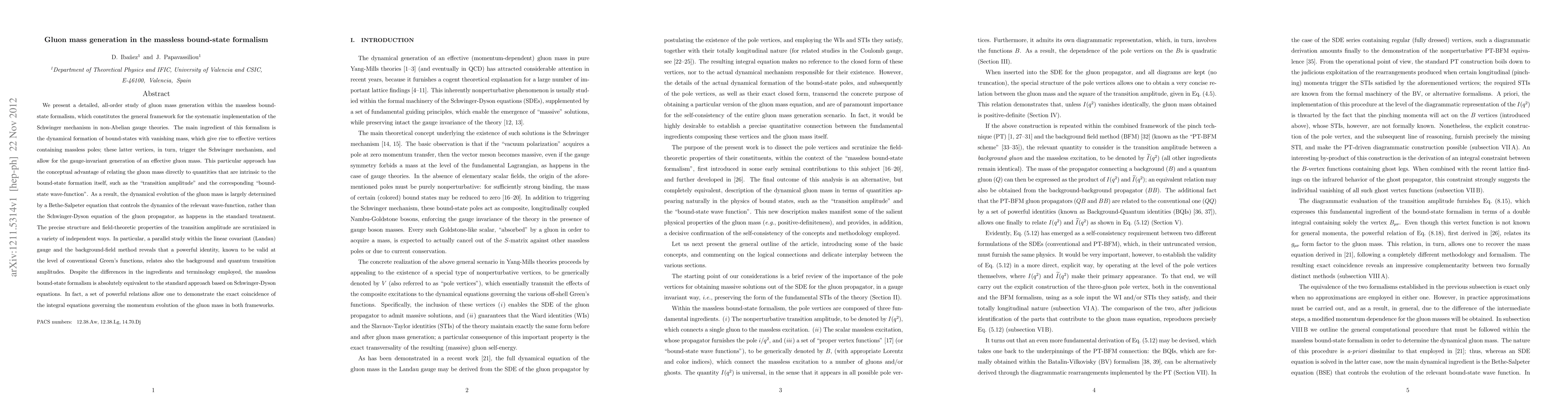 This paper explores gluon mass generation using the massless bound-state formalism, demonstrating how dynamical bound-state formation triggers the Schwinger mechanism to generate an effective gluon mass. The approach reveals a Bethe-Salpeter equation governing the gluon mass evolution, showing equivalence to the standard Schwinger-Dyson equation framework.