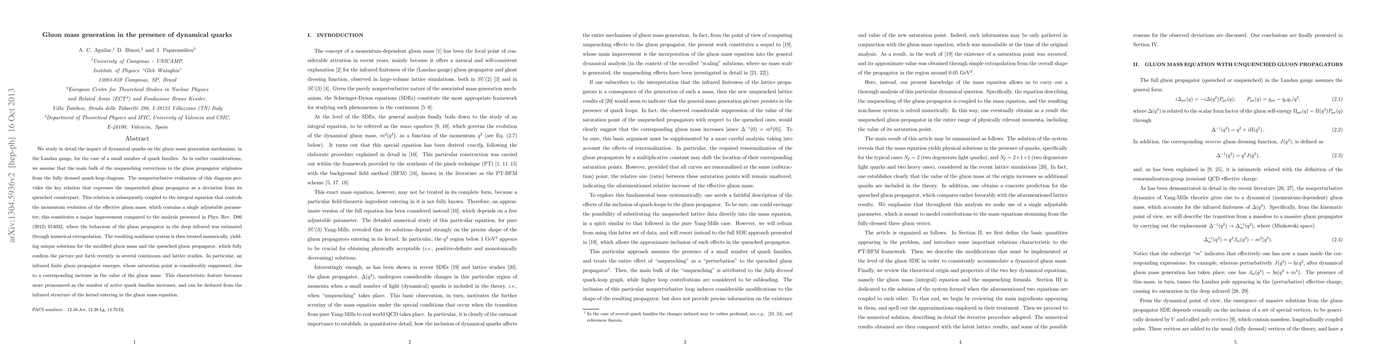This paper investigates how dynamical quarks influence gluon mass generation in the Landau gauge, revealing that the inclusion of quark families leads to a suppressed saturation point of the gluon propagator and an increased gluon mass, confirmed through a nonperturbative evaluation and numerical treatment of the integral equation.