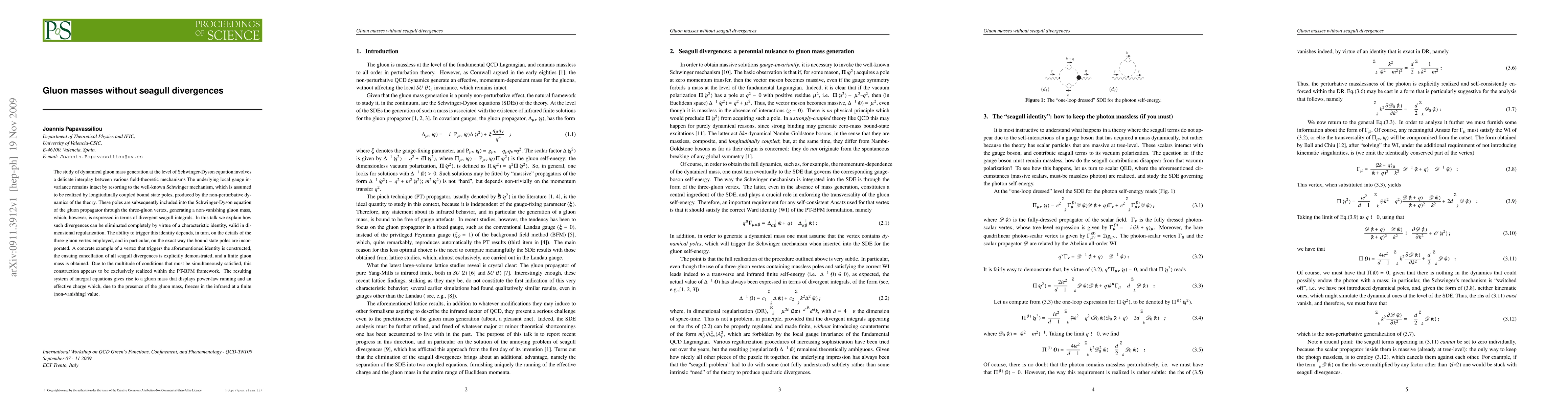 The study of dynamical gluon mass generation at the level of Schwinger-Dyson equation involves a delicate interplay between various field-theoretic mechanisms The underlying local gauge invariance remains intact by resorting to the well-known Schwinger mechanism, which is assumed to be realized by longitudinally coupled bound state poles, produced by the non-perturbative dynamics of the theory. These poles are subsequently included into the Schwinger-Dyson equation of the gluon propagator through the three-gluon vertex, generating a non-vanishing gluon mass, which, however, is expressed in terms of divergent seagull integrals. In this talk we explain how such divergences can be eliminated completely by virtue of a characteristic identity, valid in dimensional regularization. The ability to trigger this identity depends, in turn, on the details of the three-gluon vertex employed, and in particular, on the exact way the bound state poles are incorporated. A concrete example of a vertex that triggers the aforementioned identity is constructed, the ensuing cancellation of all seagull divergences is explicitly demonstrated, and a finite gluon mass is obtained. Due to the multitude of conditions that must be simultaneously satisfied, this construction appears to be exclusively realized within the PT-BFM framework. The resulting system of integral equations gives rise to a gluon mass that displays power-law running and an effective charge which, due to the presence of the gluon mass, freezes in the infrared at a finite (non-vanishing) value.