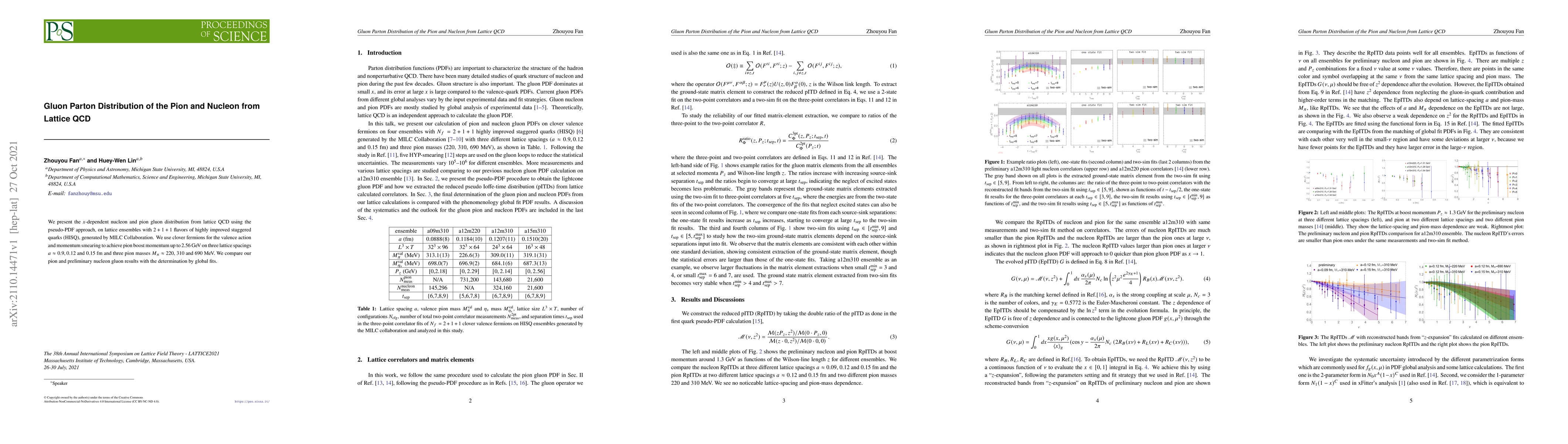 This paper reports on the $x$-dependent gluon parton distribution functions for the pion and nucleon derived from lattice QCD using the pseudo-PDF approach. The study employs $2+1+1$ flavors of HISQ on MILC ensembles, comparing results with global fits.