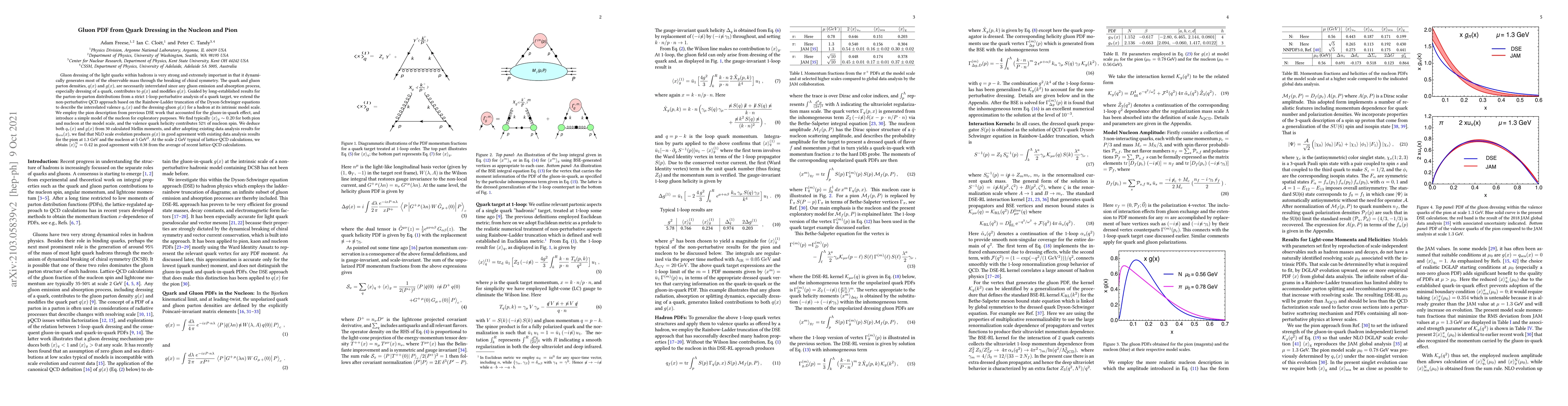 Gluon dressing of the light quarks within hadrons is very strong and extremely important in that it dynamically generates most of the observable mass through the breaking of chiral symmetry. The quark and gluon parton densities, $q(x)$ and $g(x)$, are necessarily interrelated since any gluon emission and absorption process, especially dressing of a quark, contributes to $g(x)$ and modifies $q(x)$. Guided by long-established results for the parton-in-parton distributions from a strict 1-loop perturbative analysis of a quark target, we extend the non-perturbative QCD approach based on the Rainbow-Ladder truncation of the Dyson-Schwinger equations to describe the interrelated valence $q_{\rm v}(x)$ and the dressing-gluon $g(x)$ for a hadron at its intrinsic model scale. We employ the pion description from previous DSE work that accounted for the gluon-in-quark effect and introduce a simple model of the nucleon for exploratory purposes. We find typically \mbox{$\langle x \rangle_g \sim 0.20$} for both pion and nucleon at the model scale, and the valence quark helicity contributes 52\% of nucleon spin. We deduce both $q_{\rm v}(x)$ and $g(x)$ from 30 calculated Mellin moments, and after adopting existing data analysis results for $q_{\rm sea}(x)$, we find that NLO scale evolution produces $g(x)$ in good agreement with existing data analysis results for the pion at 1.3 GeV and the nucleon at 5 GeV$^2$. At the scale 2 GeV typical of lattice-QCD calculations, we obtain \mbox{$\langle x \rangle_g^{\rm N} = 0.42$} in good agreement with 0.38 from the average of recent lattice-QCD calculations.