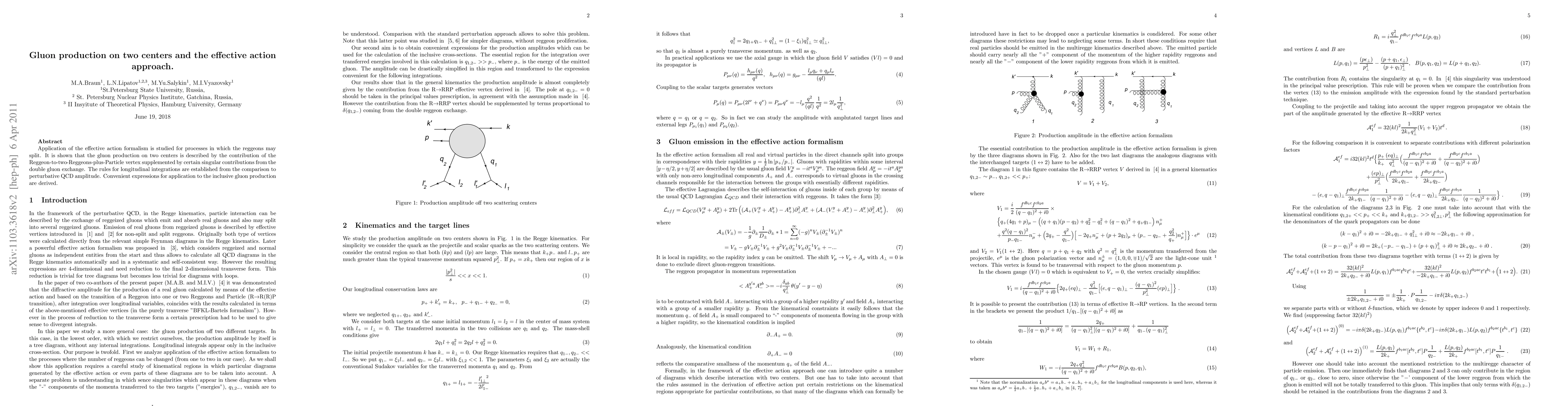 This paper applies the effective action formalism to study gluon production in two-center processes, demonstrating that it involves the Reggeon-to-two-Reggeons-plus-Particle vertex and singular double gluon exchange contributions. It establishes rules for longitudinal integrations and derives expressions for inclusive gluon production.