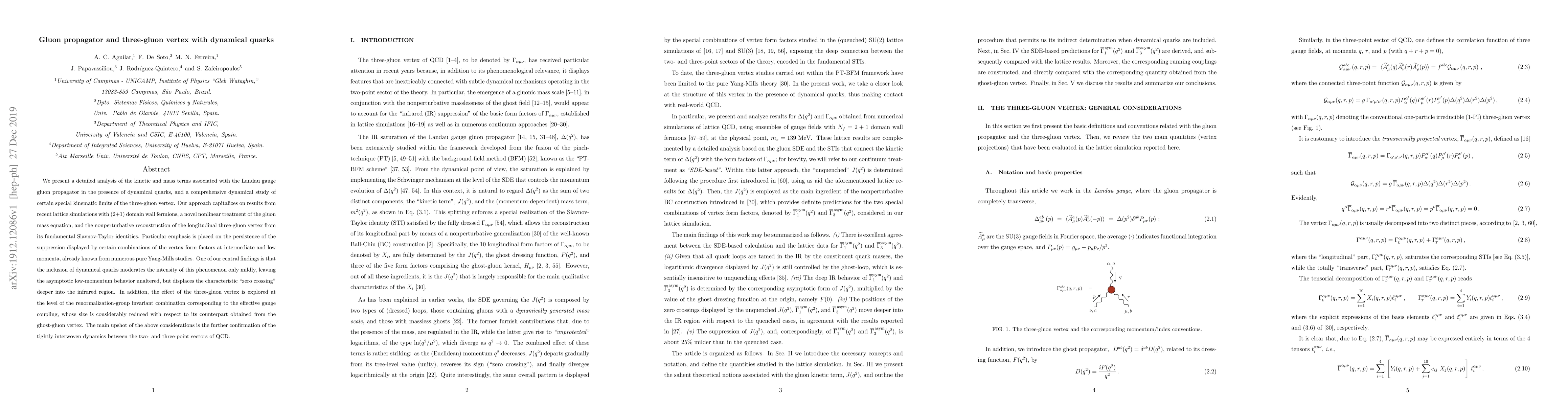 This paper investigates the gluon propagator and three-gluon vertex in the presence of dynamical quarks, revealing that while quarks slightly moderate the suppression of vertex form factors, the low-momentum behavior remains largely unchanged. The study also finds a significant reduction in the effective gauge coupling due to the three-gluon vertex.