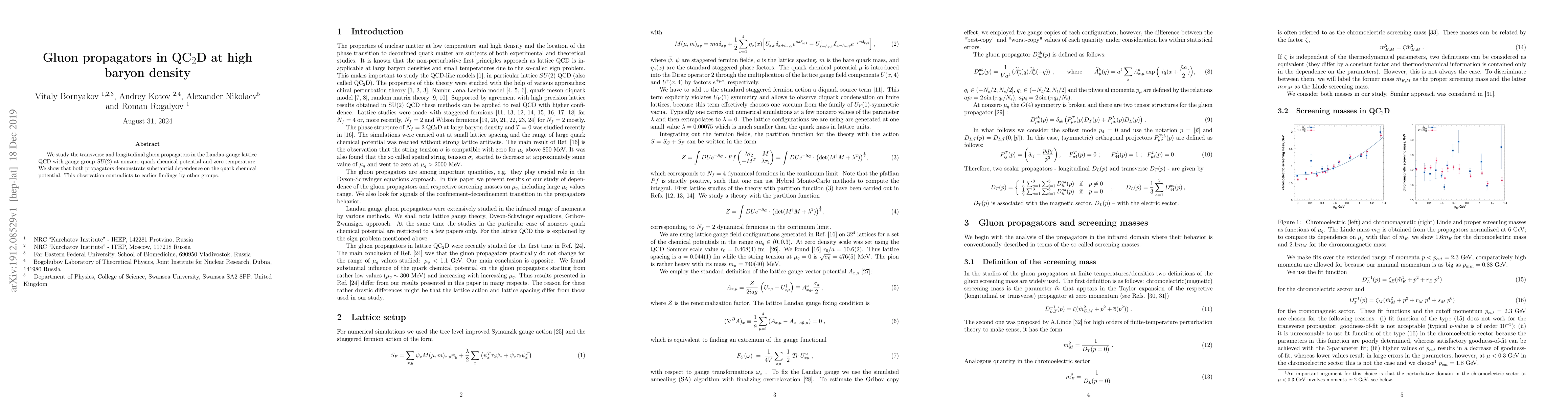 Researchers studied gluon propagators in a specific type of quantum chromodynamics at high baryon density, finding they depend on the quark chemical potential, contradicting previous findings.