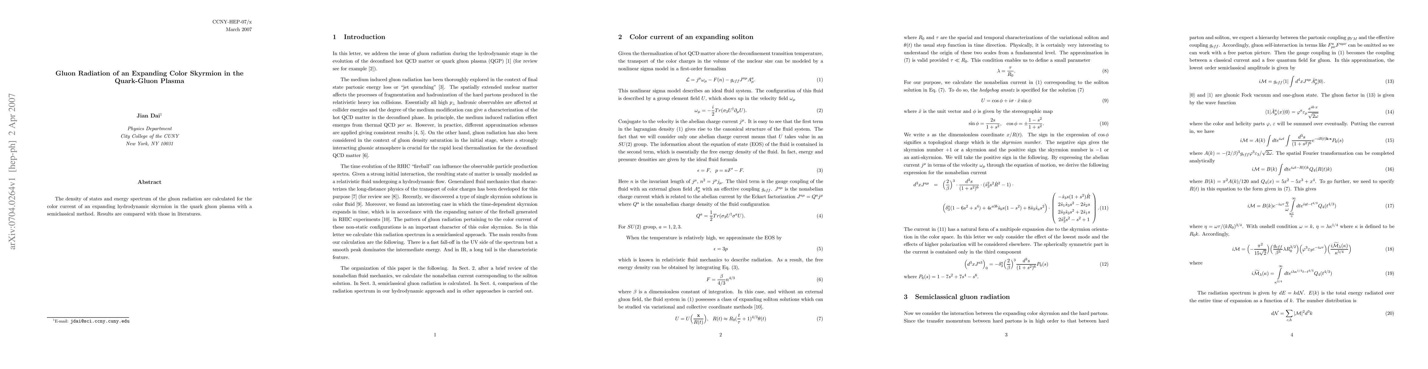 The density of states and energy spectrum of the gluon radiation are calculated for the color current of an expanding hydrodynamic skyrmion in the quark gluon plasma with a semiclassical method. Results are compared with those in literatures.