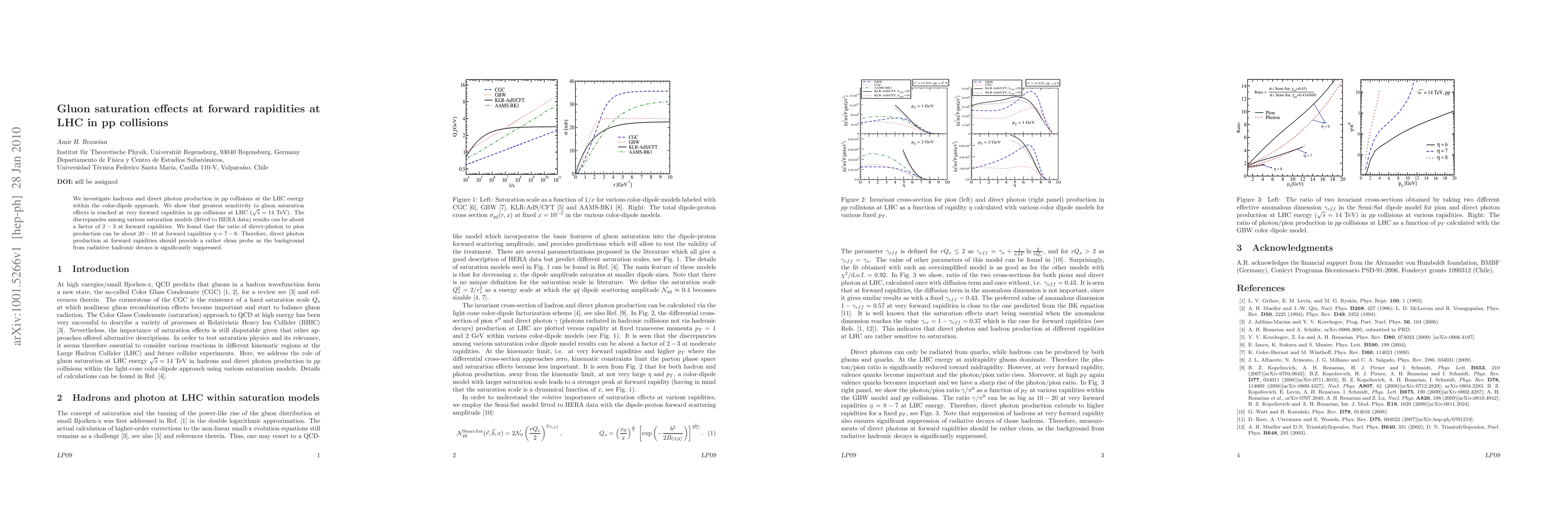 This paper examines hadron and direct photon production in proton-proton collisions at LHC energies using the color-dipole model, highlighting that gluon saturation effects are most pronounced at very forward rapidities. It reveals significant discrepancies among various saturation models, suggesting direct photon production at forward rapidities (\eta=7-8) as a clean probe due to suppressed background from radiative hadronic decays.