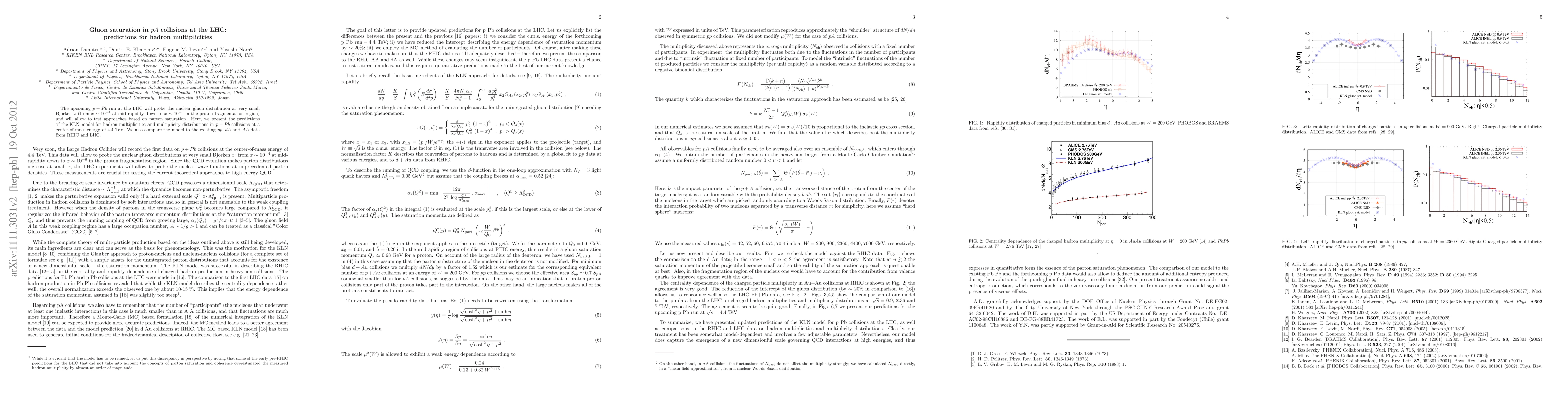 This paper presents the KLN model's predictions for hadron multiplicities and distributions in p+Pb collisions at the LHC, focusing on probing nuclear gluon distribution at very small Bjorken x. It also compares these predictions to existing pp, dA, and AA data from RHIC and LHC to test parton saturation approaches.