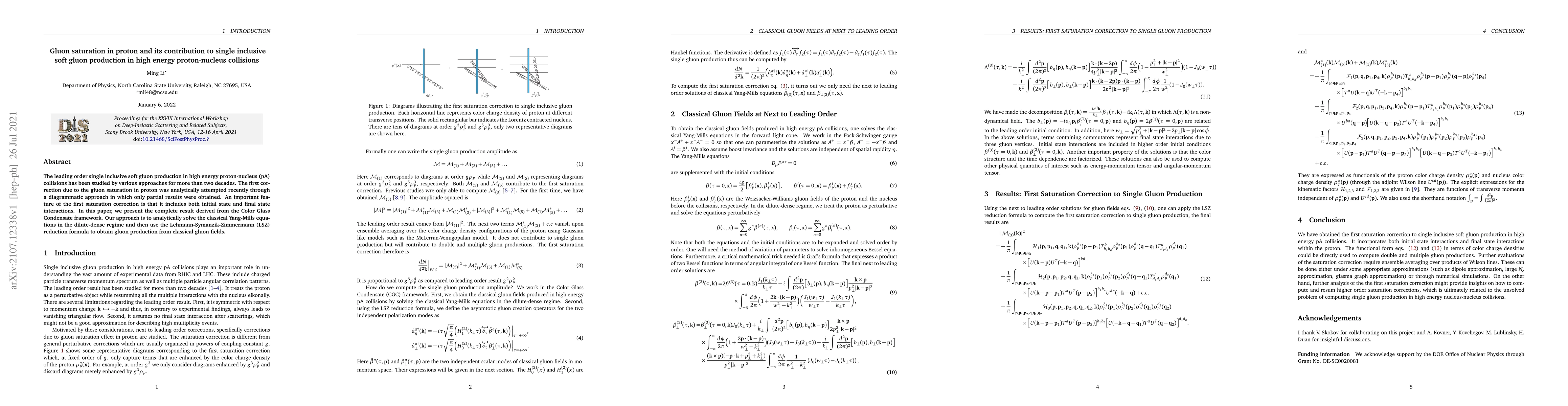 This paper presents a complete analytical solution for the first correction to leading order single inclusive soft gluon production in high energy proton-nucleus collisions, derived from the Color Glass Condensate framework. The study accounts for gluon saturation effects in the proton, incorporating both initial and final state interactions through the solution of classical Yang-Mills equations and the LSZ reduction formula.