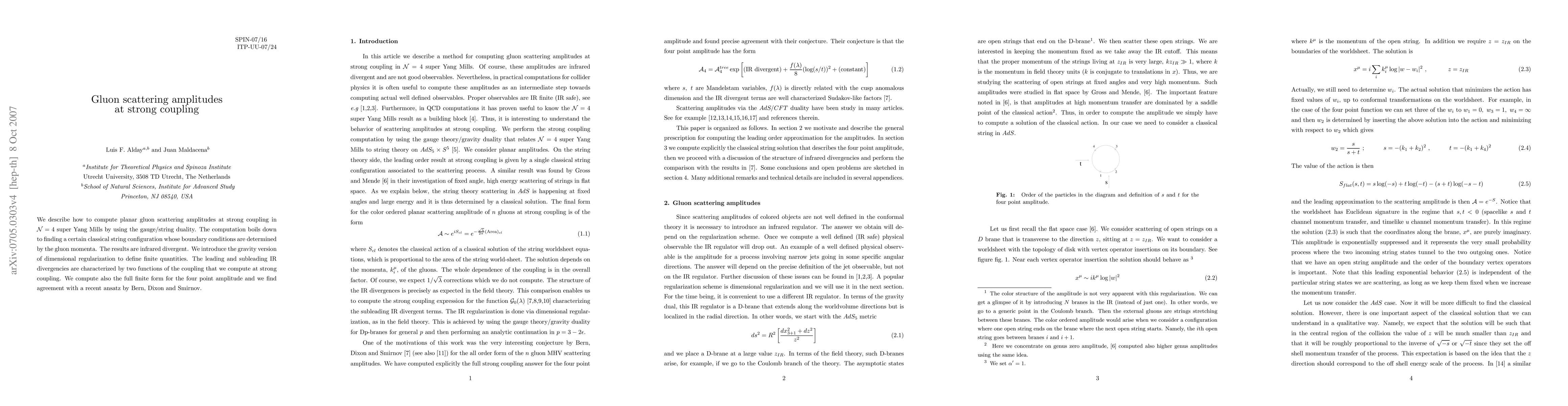 We describe how to compute planar gluon scattering amplitudes at strong coupling in N=4 super Yang Mills by using the gauge/string duality. The computation boils down to finding a certain classical string configuration whose boundary conditions are determined by the gluon momenta. The results are infrared divergent. We introduce the gravity version of dimensional regularization to define finite quantities. The leading and subleading IR divergencies are characterized by two functions of the coupling that we compute at strong coupling. We compute also the full finite form for the four point amplitude and we find agreement with a recent ansatz by Bern, Dixon and Smirnov.