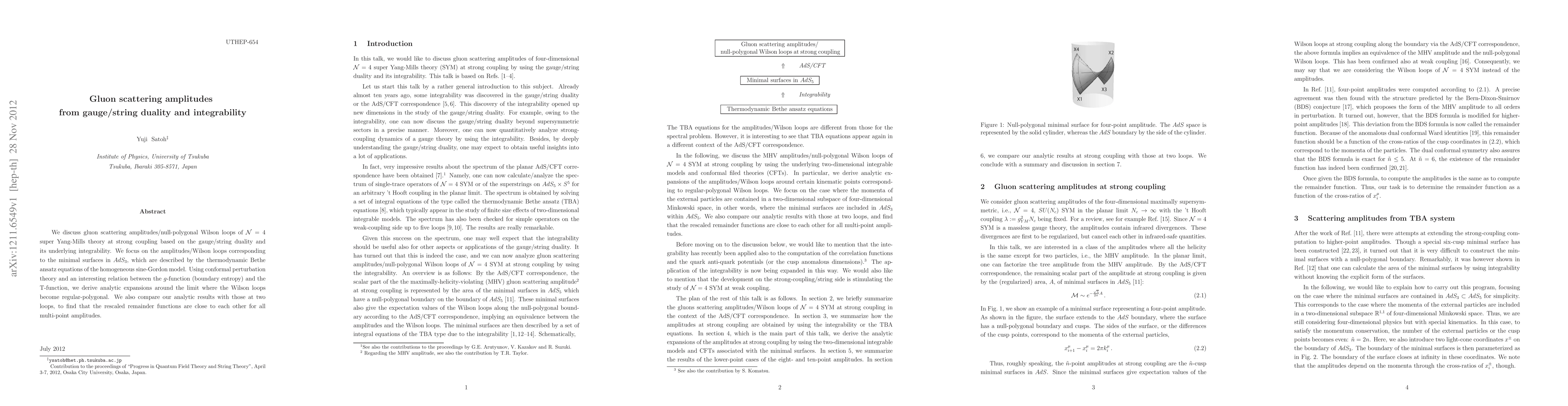 This research explores gluon scattering amplitudes in N=4 super Yang-Mills theory at strong coupling through gauge/string duality and integrability, focusing on minimal surfaces in AdS_3 and their connection to the thermodynamic Bethe ansatz. Analytic expansions are derived and compared to two-loop results, showing similarities in rescaled remainder functions across multi-point amplitudes.