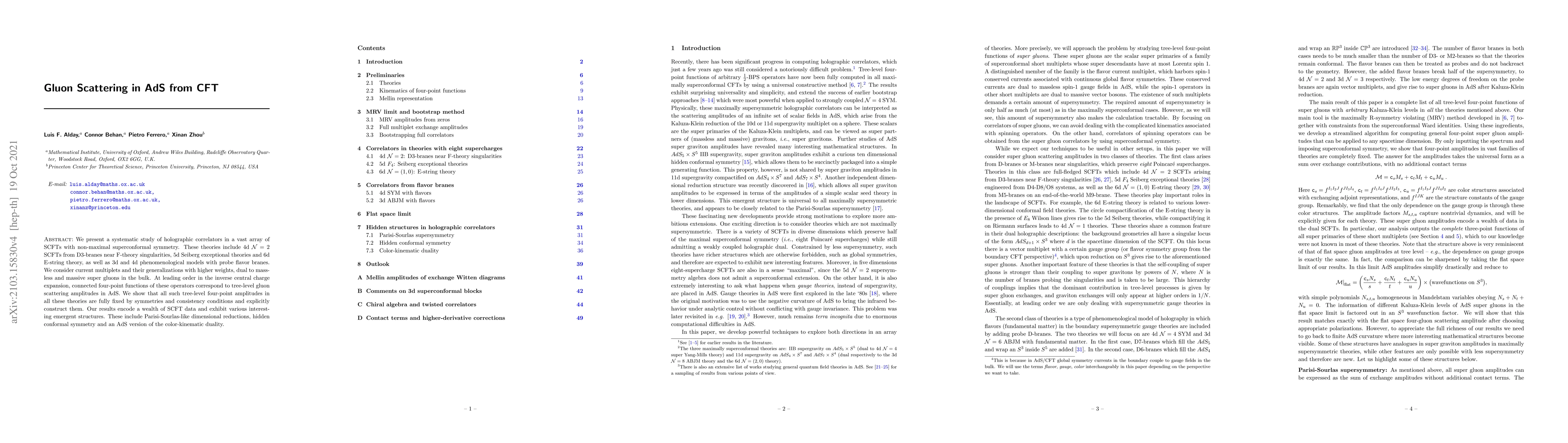 Researchers studied holographic correlators in various superconformal theories, finding that tree-level gluon scattering amplitudes in AdS are fully determined by symmetries and consistency conditions, revealing emergent structures including dimensional reductions and duality relations.