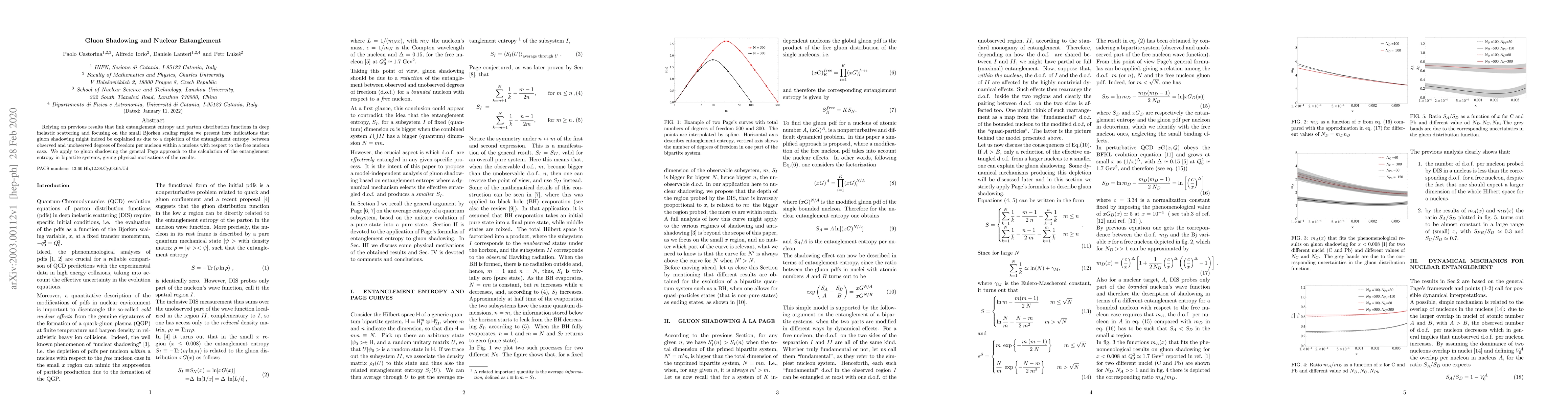 Relying on previous results that link entanglement entropy and parton distribution functions in deep inelastic scattering and focusing on the small Bjorken scaling region we present here indications that gluon shadowing might indeed be explained as due to a depletion of the entanglement entropy between observed and unobserved degrees of freedom per nucleon within a nucleus with respect to the free nucleon case. We apply to gluon shadowing the general Page approach to the calculation of the entanglement entropy in bipartite systems, giving physical motivations of the results.