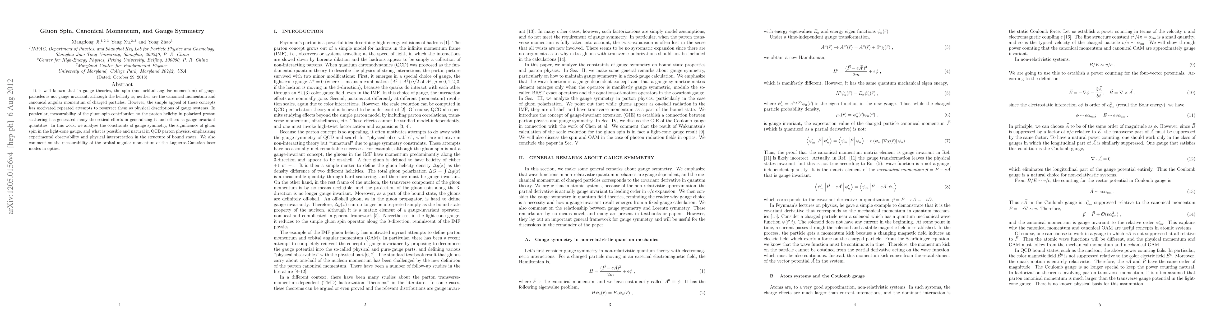 It is well known that in gauge theories, the spin (and orbital angular momentum) of gauge particles is not gauge invariant, although the helicity is; neither are the canonical momentum and canonical angular momentum of charged particles. However, the simple appeal of these concepts has motivated repeated attempts to resurrect them as physical descriptions of gauge systems. In particular, measurability of the gluon-spin-contribution to the proton helicity in polarized proton scattering has generated many theoretical efforts in generalizing it and others as gauge-invariant quantities. In this work, we analyze the constraints of gauge symmetry, the significance of gluon spin in the light-cone gauge, and what is possible and natural in QCD parton physics, emphasizing experimental observability and physical interpretation in the structure of bound states. We also comment on the measurability of the orbital angular momentum of the Laguerre-Gaussian laser modes in optics.