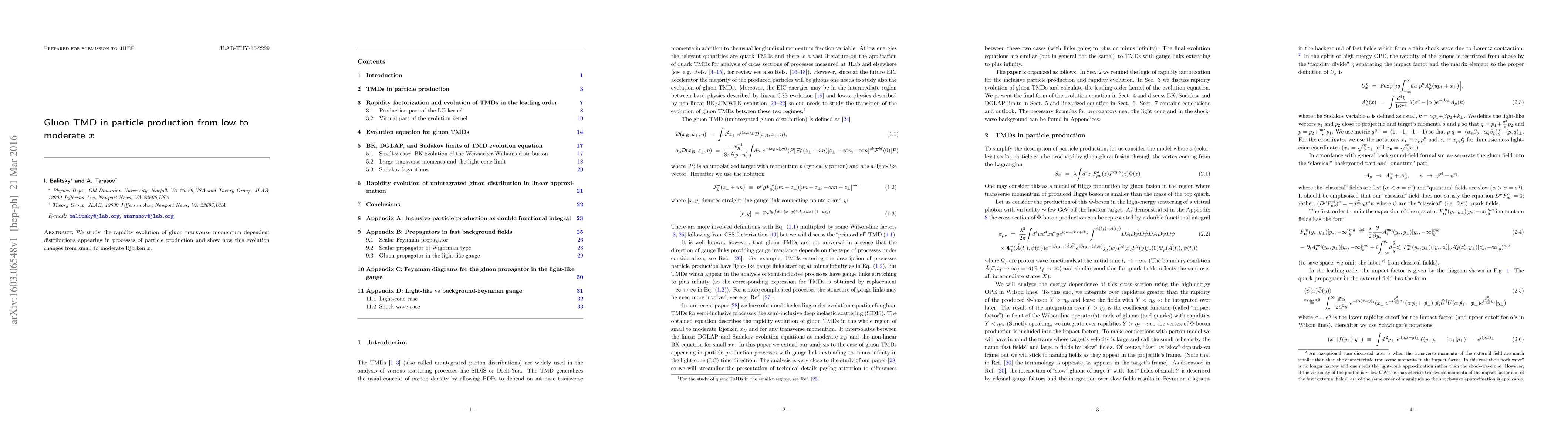 Summary: This paper investigates the rapidity evolution of gluon transverse momentum dependent distributions in particle production, highlighting the transition in this evolution from low to moderate Bjorken x values.