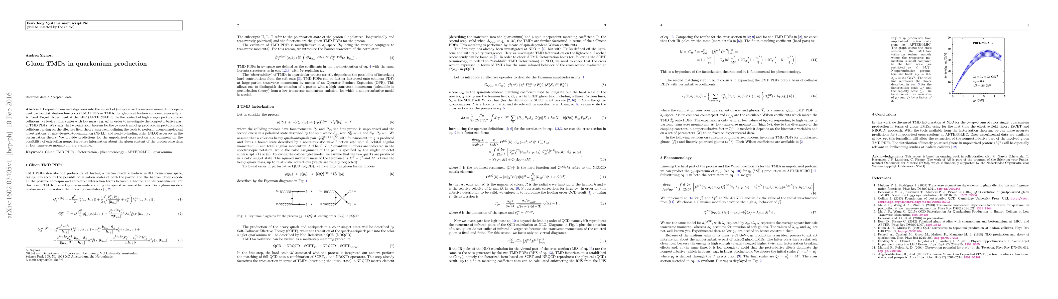 I report on our investigations into the impact of (un)polarized transverse momentum dependent parton distribution functions (TMD PDFs or TMDs) for gluons at hadron colliders, especially at A Fixed Target Experiment at the LHC (AFTER@LHC). In the context of high energy proton-proton collisions, we look at final states with low mass (e.g. $\eta_b$) in order to investigate the nonperturbative part of TMD PDFs. We study the factorization theorem for the $q_T$ spectrum of $\eta_b$ produced in proton-proton collisions relying on the effective field theory approach, defining the tools to perform phenomenological investigations at next-to-next-to-leading log (NNLL) and next-to-leading order (NLO) accuracy in the perturbation theory. We provide predictions for the unpolarized cross section and comment on the possibility of extracting nonperturbative information about the gluon content of the proton once data at low transverse momentum are available.
