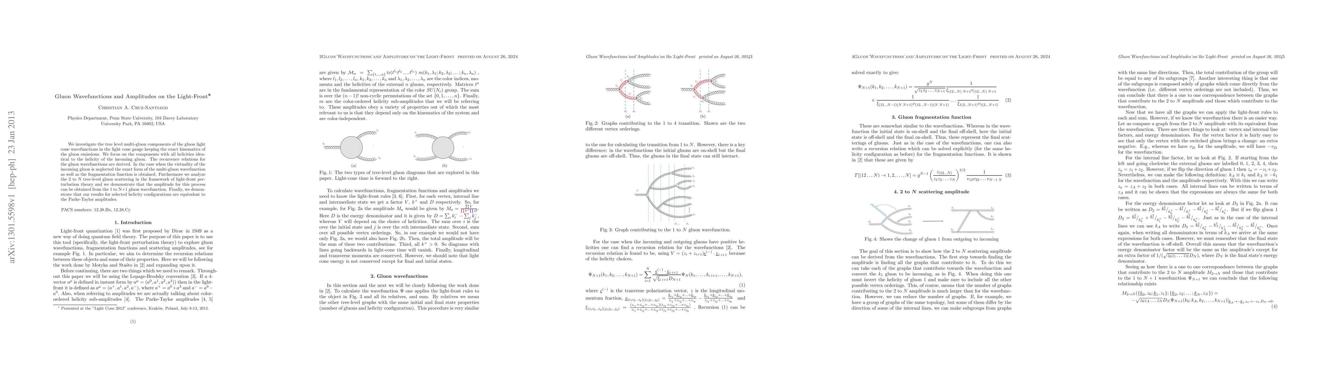 This paper derives recurrence relations for gluon light cone wavefunctions in the light-front gauge, focusing on identical helicity components. It also explores the 2 to N tree-level gluon scattering, showing the amplitude can be derived from the 1 to N+1 gluon wavefunction, and finds equivalence with Parke-Taylor amplitudes for specific helicity configurations.