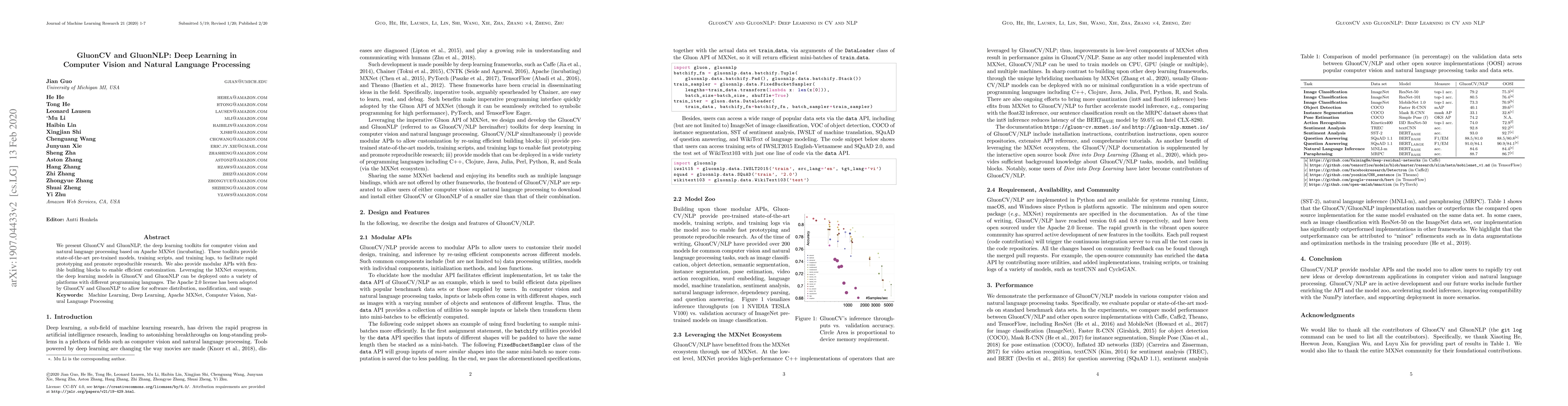 Summary: GluonCV and GluonNLP are deep learning toolkits for computer vision and natural language processing built on Apache MXNet, offering pre-trained models and modular APIs for easy customization and deployment across various platforms. The toolkits are open-source under the Apache 2.0 license.