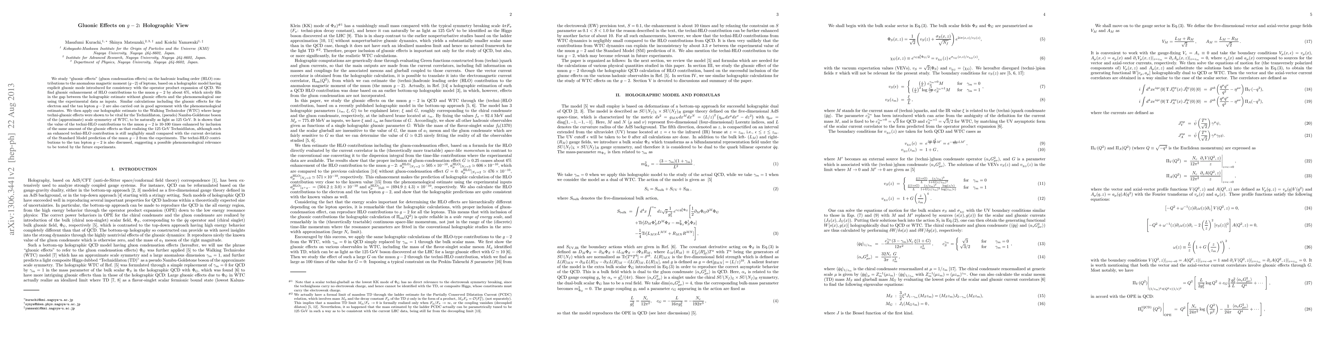 This study uses a holographic model to investigate how gluon condensation affects the leading order hadronic contributions to the anomalous magnetic moment (g-2) of leptons. The research finds a 6% enhancement in muon g-2 due to gluonic effects, bridging the gap between previous holographic and phenomenological estimates. Similar calculations are conducted for electron and tau lepton g-2, aligning with phenomenological estimates. The model also applies to Walking Technicolor, showing that techni-HLO contributions to muon g-2 could be 10-100 times larger with the same gluonic effects enabling a 125 GeV Technidilaton, though still small compared to current experimental deviations. The paper also discusses tau lepton g-2 implications, suggesting potential future experimental tests.